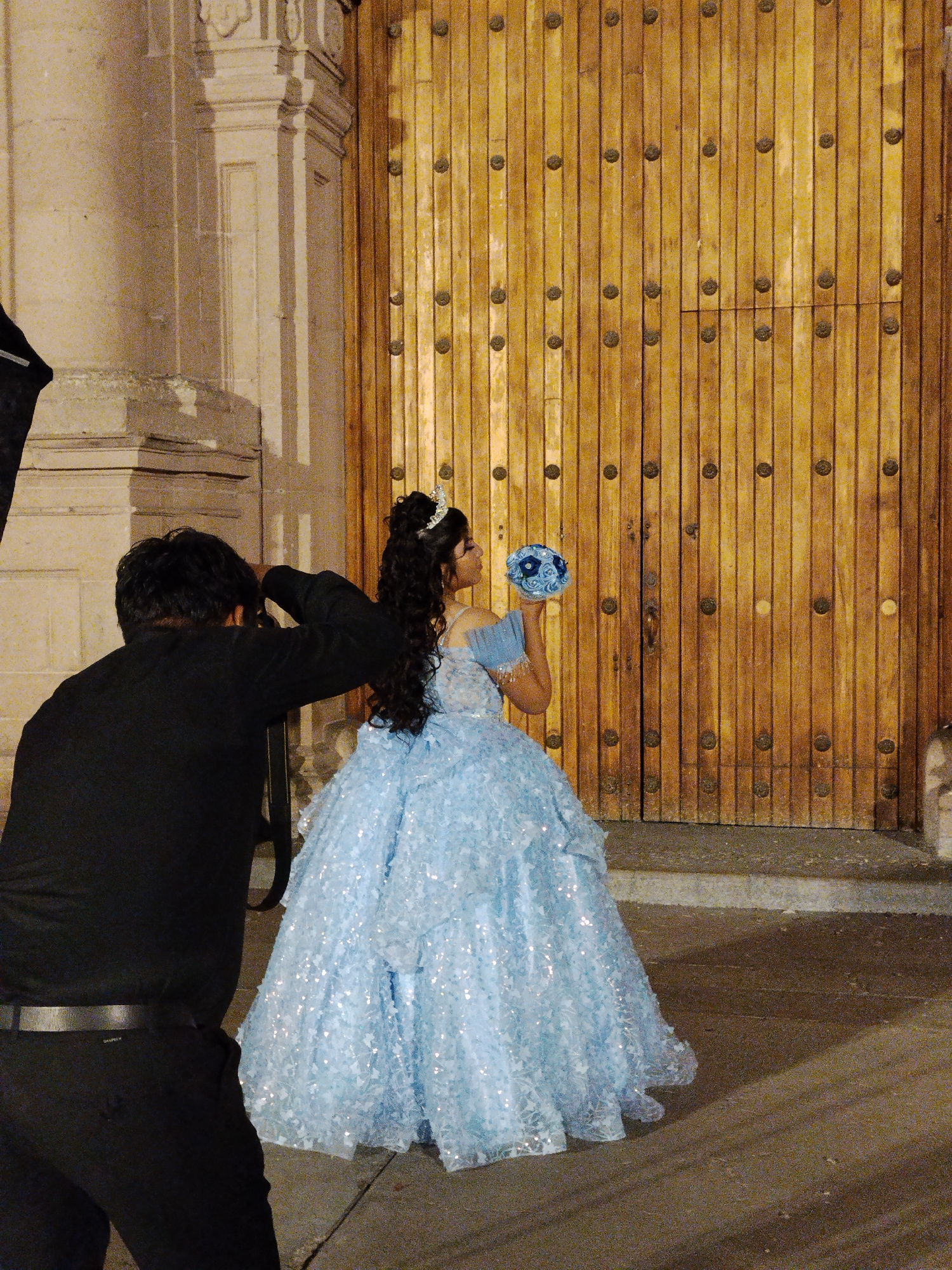 A photograph captures a quinceañera, a young woman celebrating her fifteenth birthday, posing for a photographer. The quinceañera stands in front of a large wooden door with metal studs. She wears a l…read more