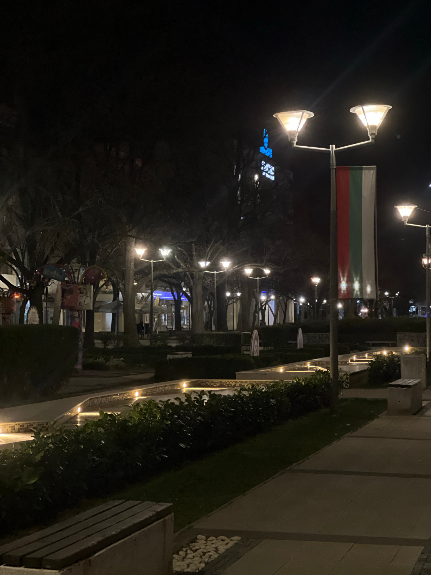 At night in Pernik, Bulgaria, a Bulgarian flag is illuminated by street lamps. The foreground features illuminated walkways lined with manicured hedges. Beyond this, a street stretches into the distanβ¦read more