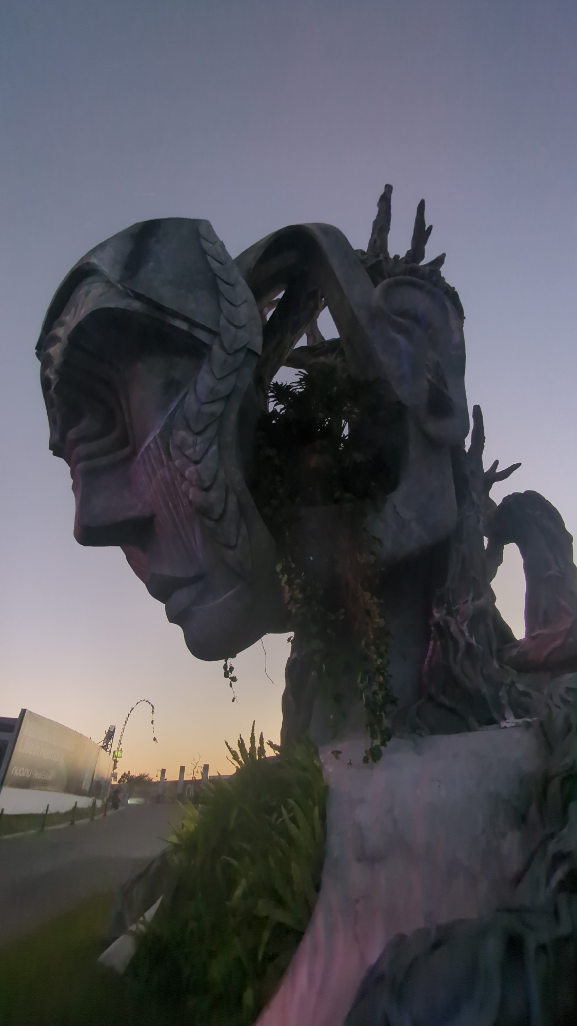 The image displays a massive, intricately carved sculpture set against a twilight sky in Kediri, Indonesia. The photograph is oriented vertically, with the top of the scene on the left and the bottomβ¦read more