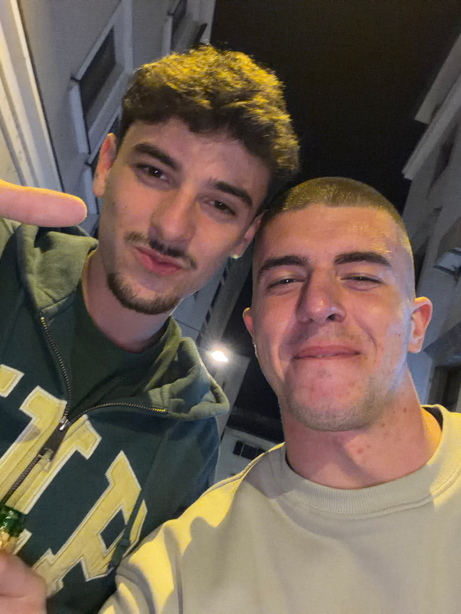 Two men are captured in a selfie-style photo. The man on the right has a shaved head and is wearing a light-colored sweatshirt. The man on the left has dark curly hair and a goatee, and he's wearing a…read more