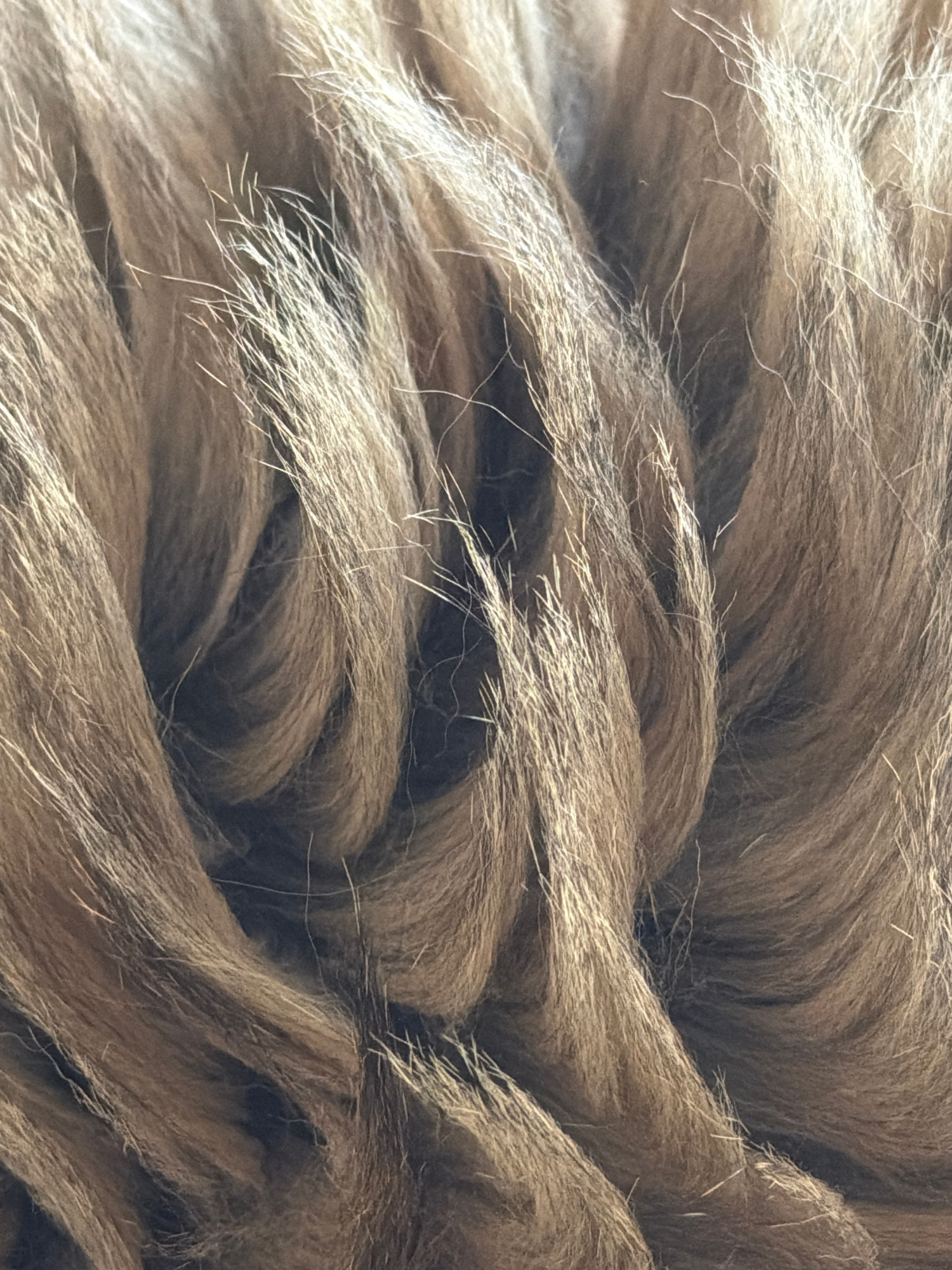The image shows a close-up of brown fur. Individual strands of fur are visible, with varying shades of light and dark brown. The fur is arranged in layered, curving patterns. There is no indication of…read more