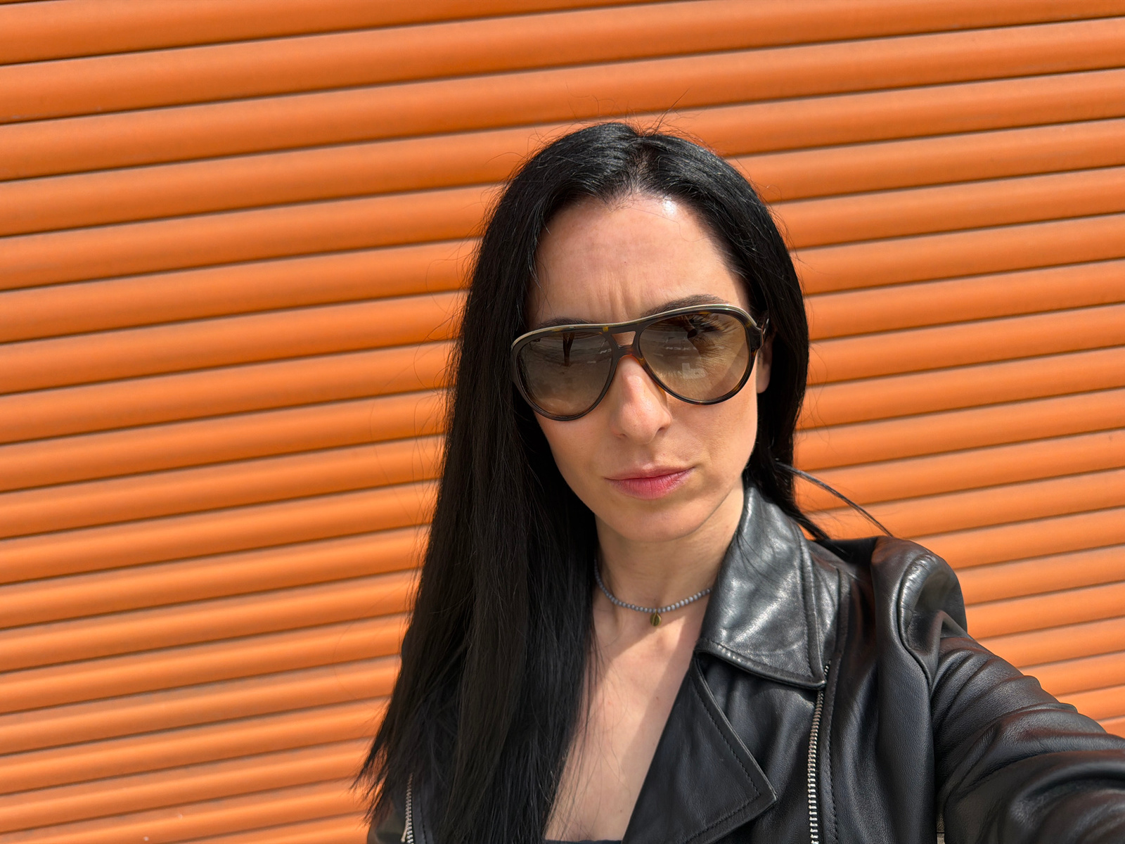 A woman with long black hair stands in front of an orange horizontally ribbed wall, wearing a black leather jacket, a gray beaded necklace with a gold pendant, and large aviator sunglasses. The locati…read more