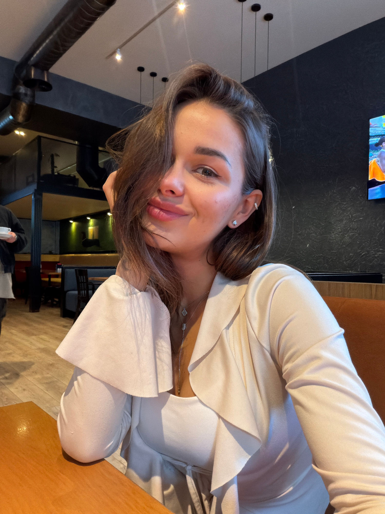 The image shows a woman sitting at a table, likely indoors. She has brown hair and is wearing a white blouse or dress. Her hair is partially covering her face. She appears to be smiling. The backgroun…read more