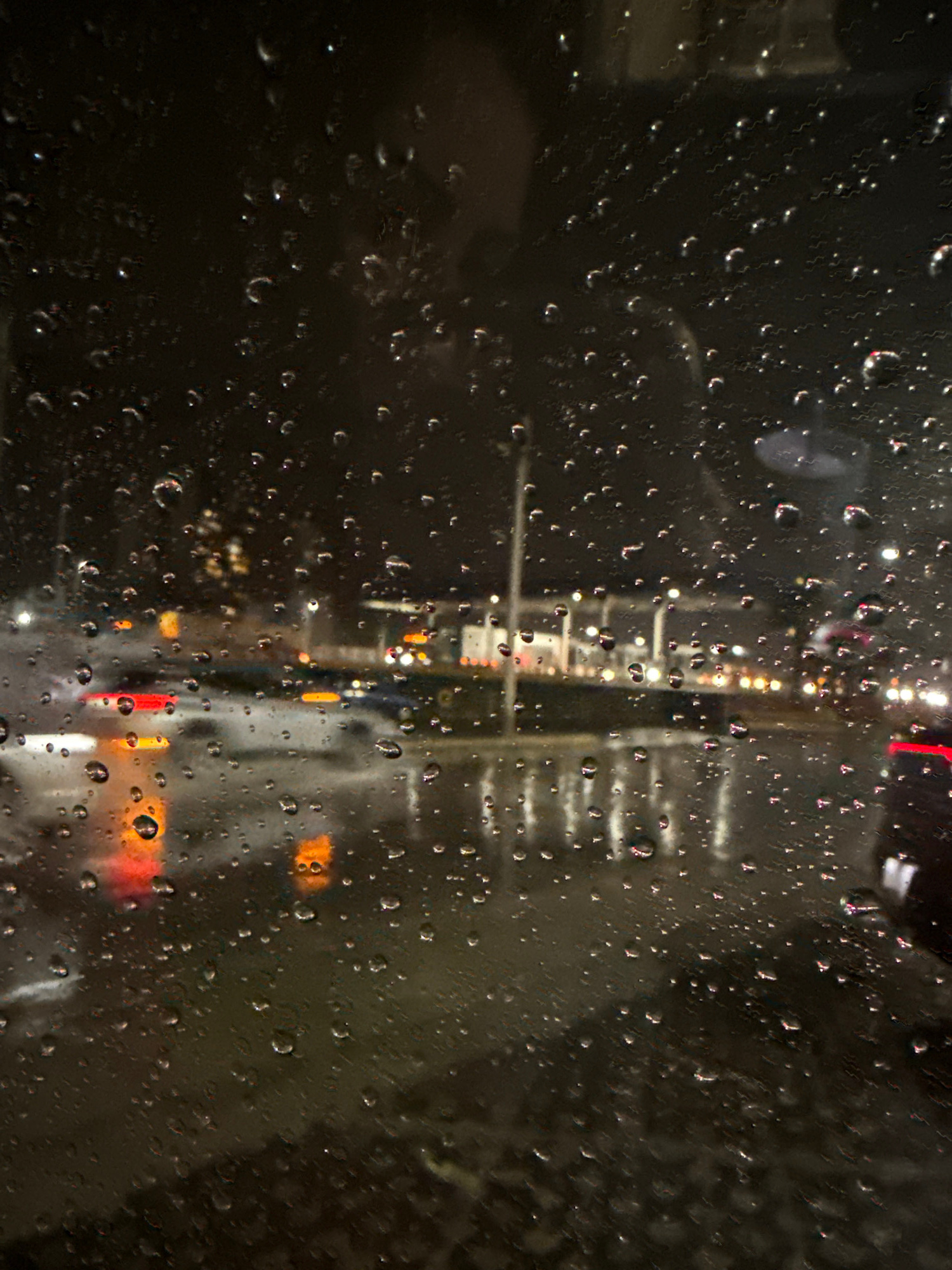 The image depicts a rainy night scene through a vehicle window. Numerous raindrops cover the glass, distorting the view of the city lights outside. In the background, vertical lines of lights suggest…read more