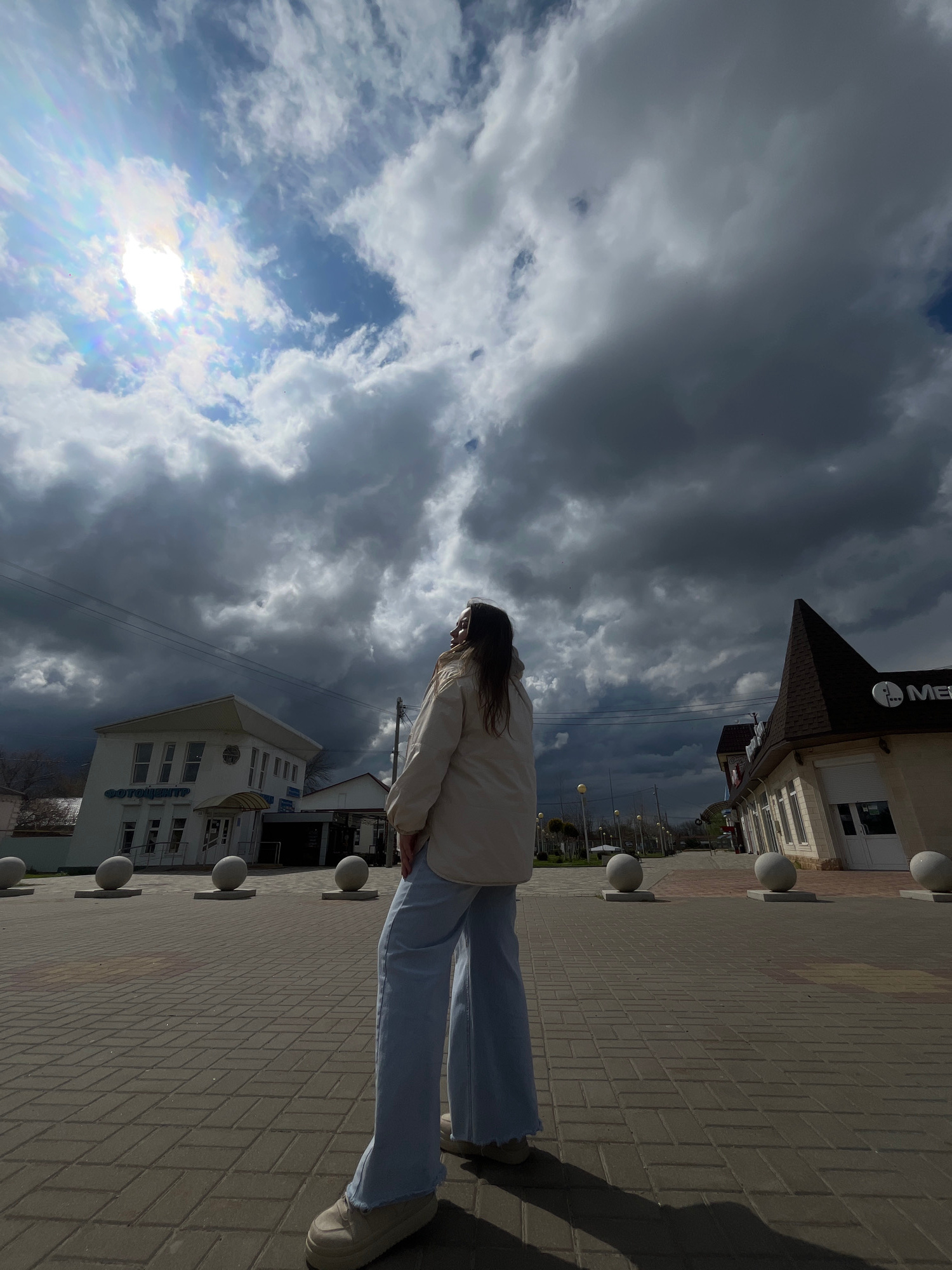 A ground-level, tilted, medium shot shows a woman standing on a pedestrian walkway in Novopokrovskaya, Russia. The walkway is made of light brown paving stones with spherical concrete bollards. The wo…read more