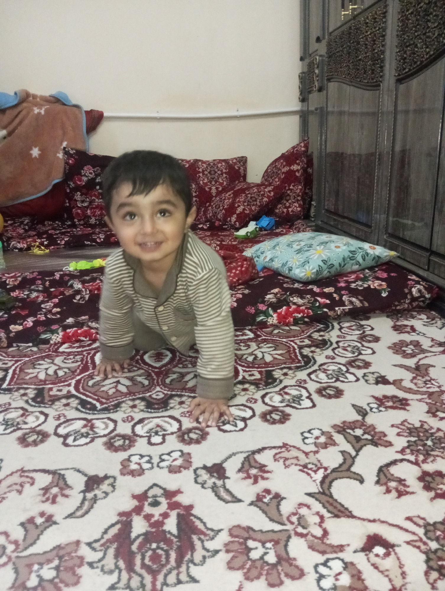 A young child, likely a toddler, is crawling on a patterned rug in an interior setting. The child is wearing a striped pajama set and is smiling. The rug has a repeating pattern of floral and abstract…read more