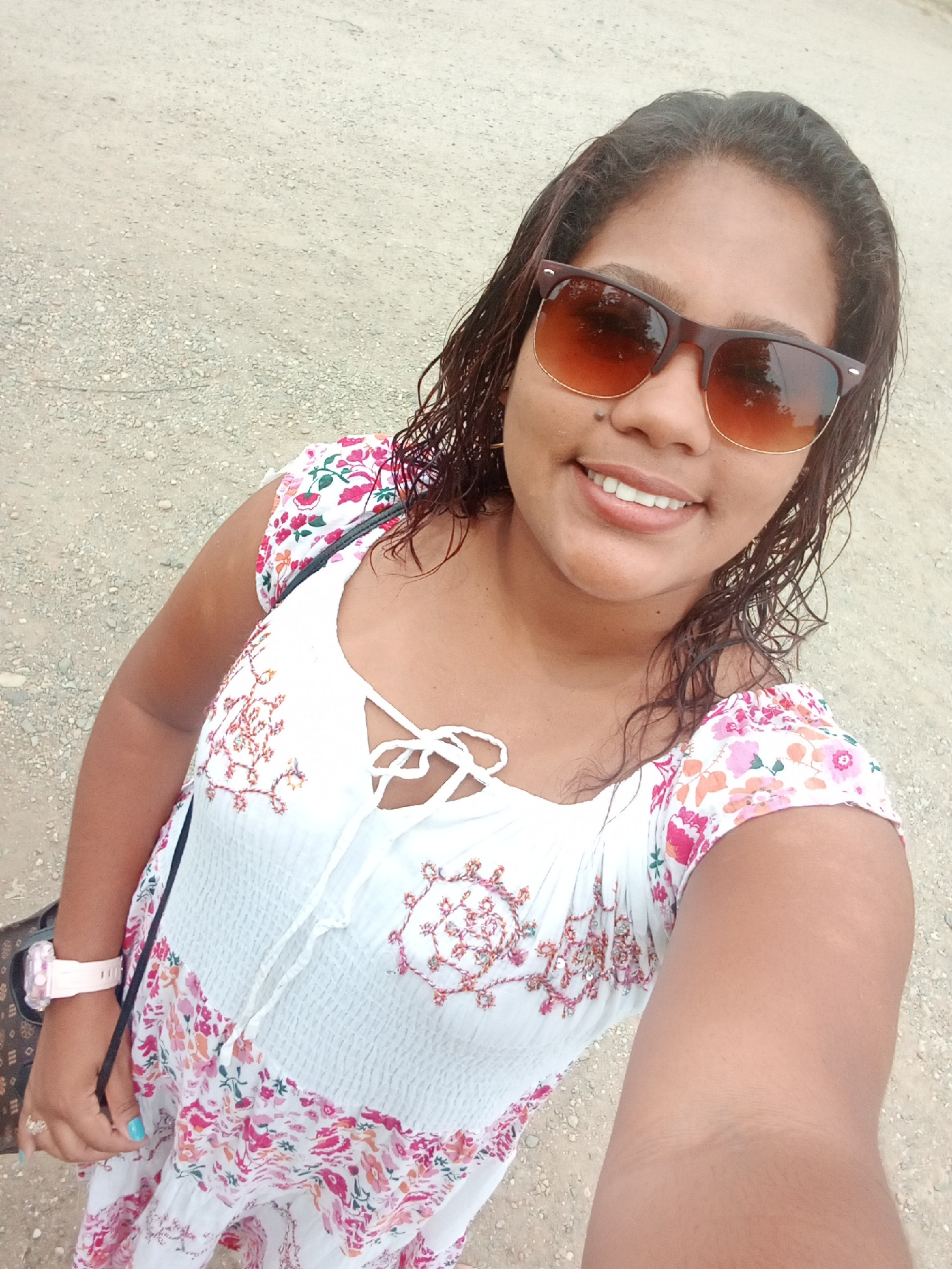A woman is posing for a selfie outdoors in Parroquia Ocumare, Venezuela. She is wearing sunglasses, a white dress with floral patterns, and a pink watch. A purse is slung over her shoulder. The backgr…read more