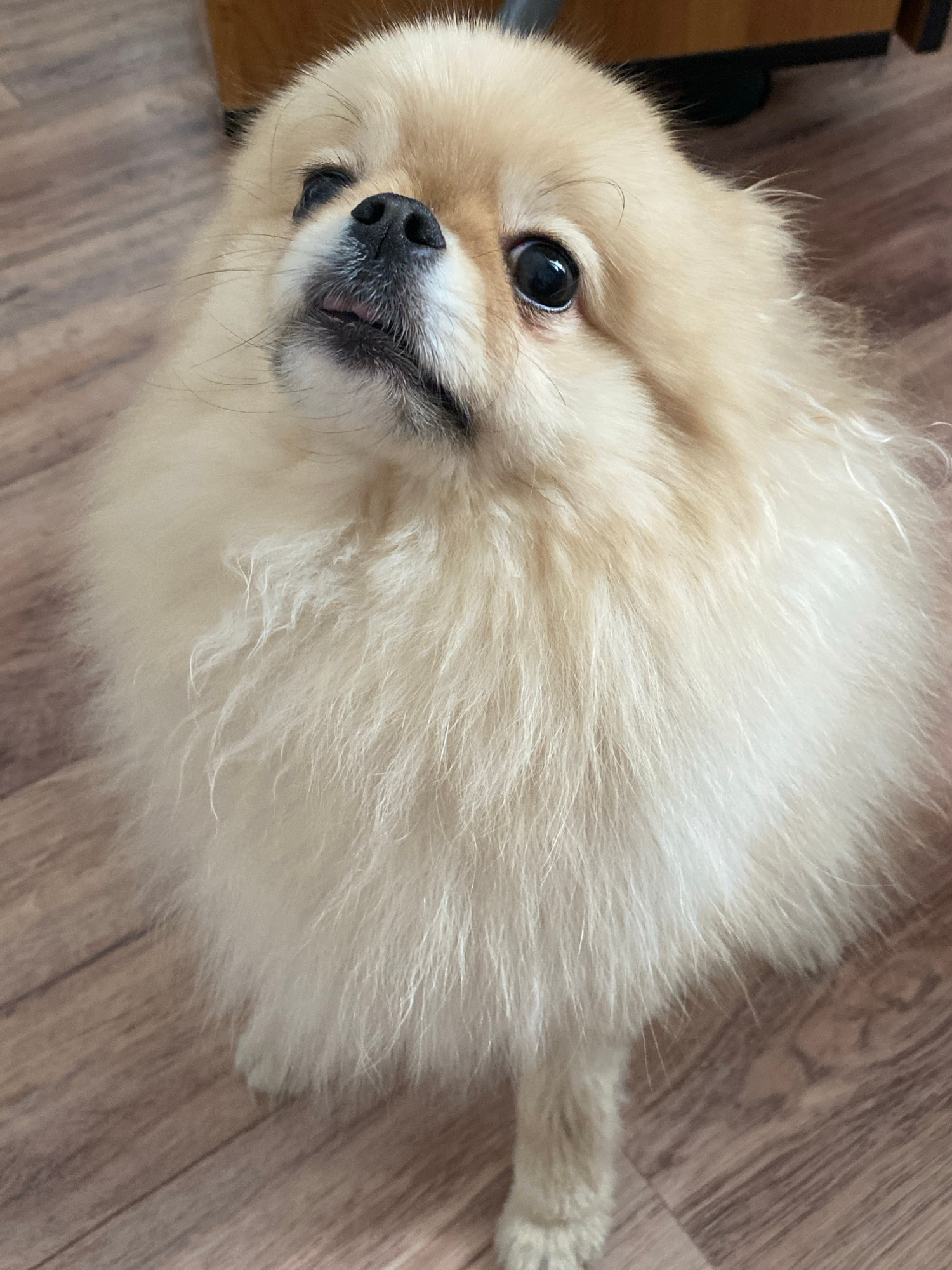 A tan Pomeranian dog with black eyes and nose sits on a light brown wood-look floor. A portion of dark brown furniture is visible in the upper left corner of the image. The location is Unknown, Unknow…read more