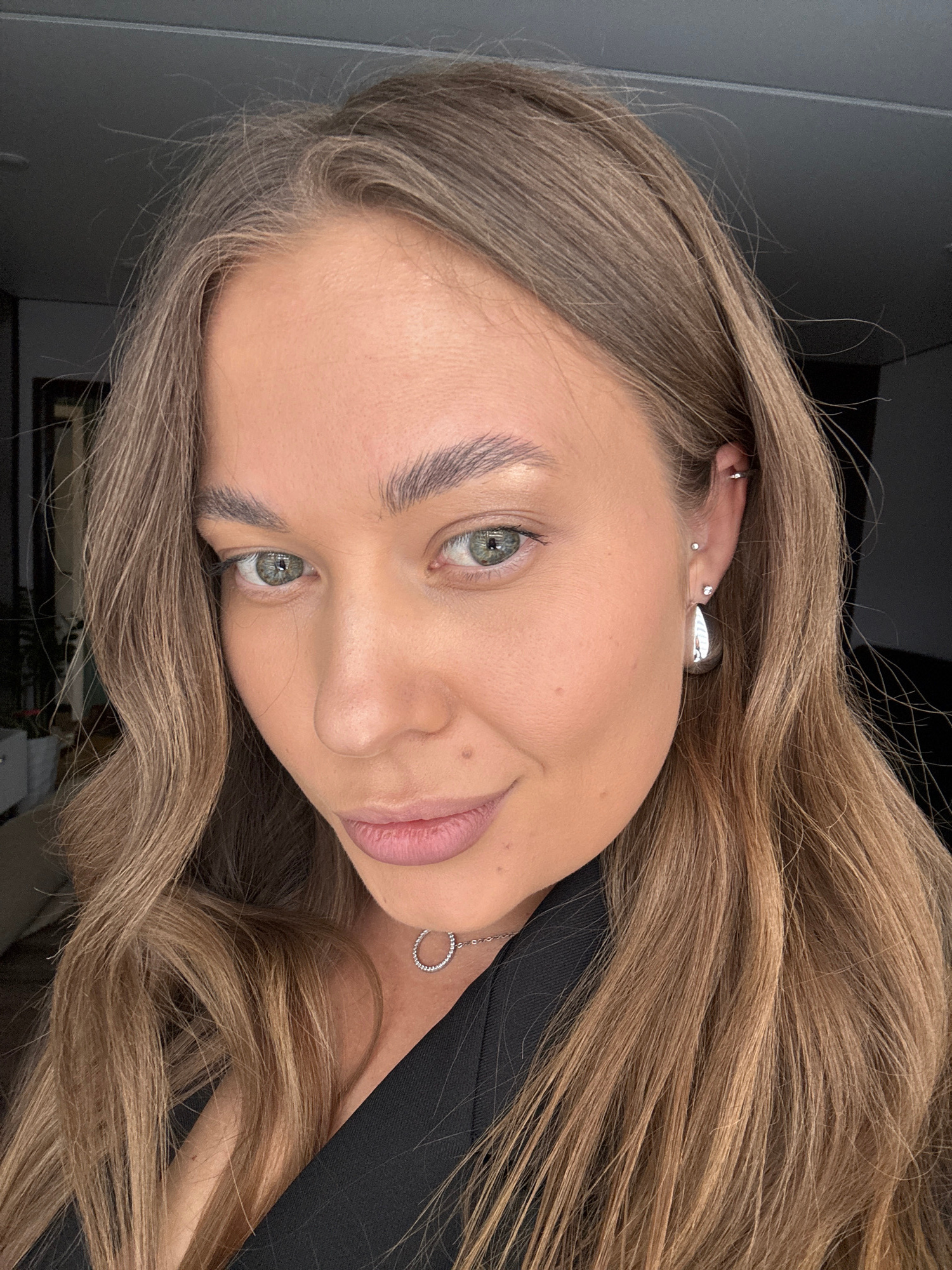 A close-up, rotated portrait of a woman with long, light brown hair. She has fair skin, green eyes, and light eyebrows. She is wearing a black top and silver jewelry, including earrings and a necklace…read more