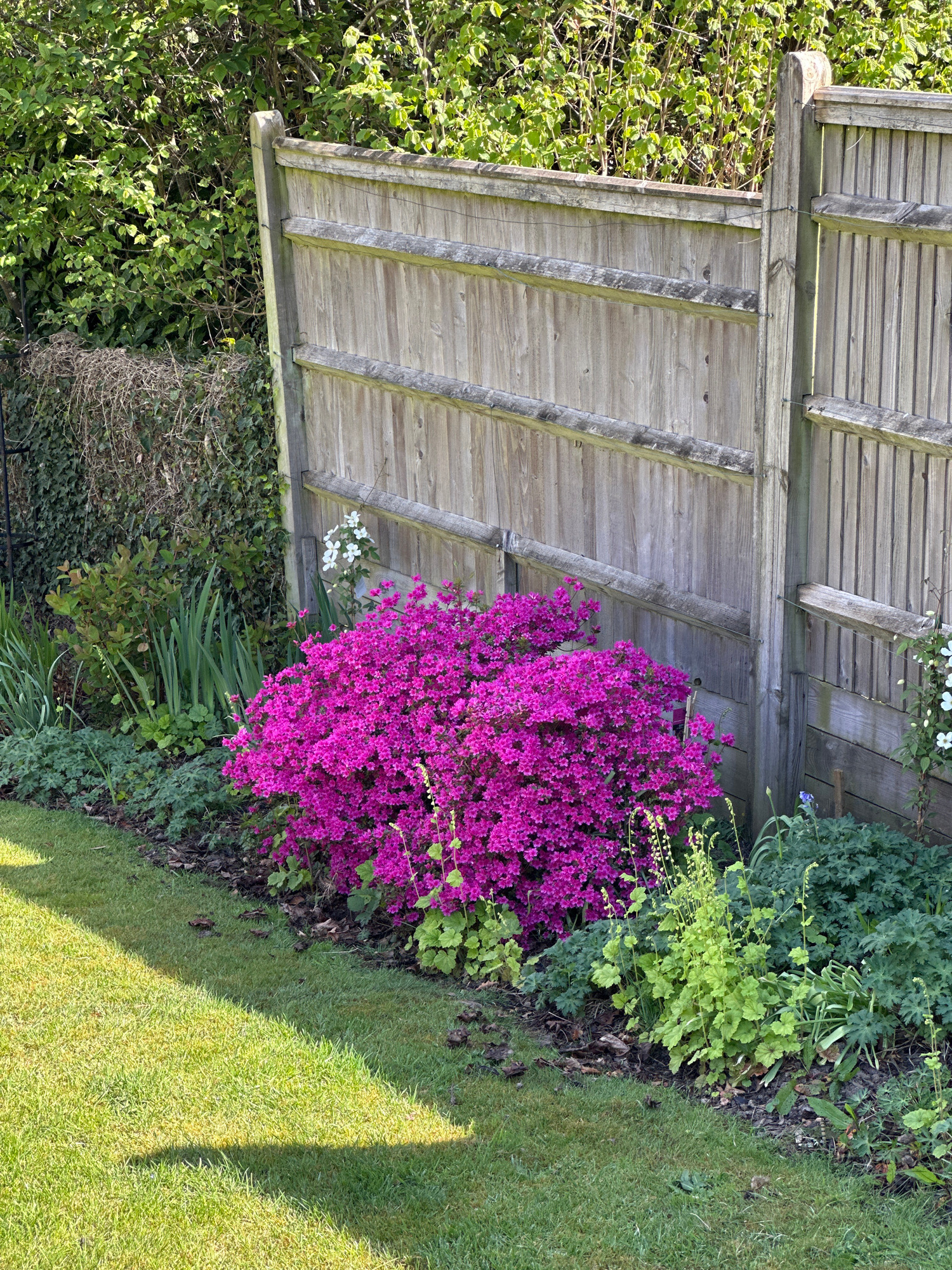 The image shows a garden scene in Tunbridge Wells, United Kingdom. A weathered wooden fence forms a backdrop to the left of the frame. A large, dense bush of vibrant purple flowers is situated near th…read more