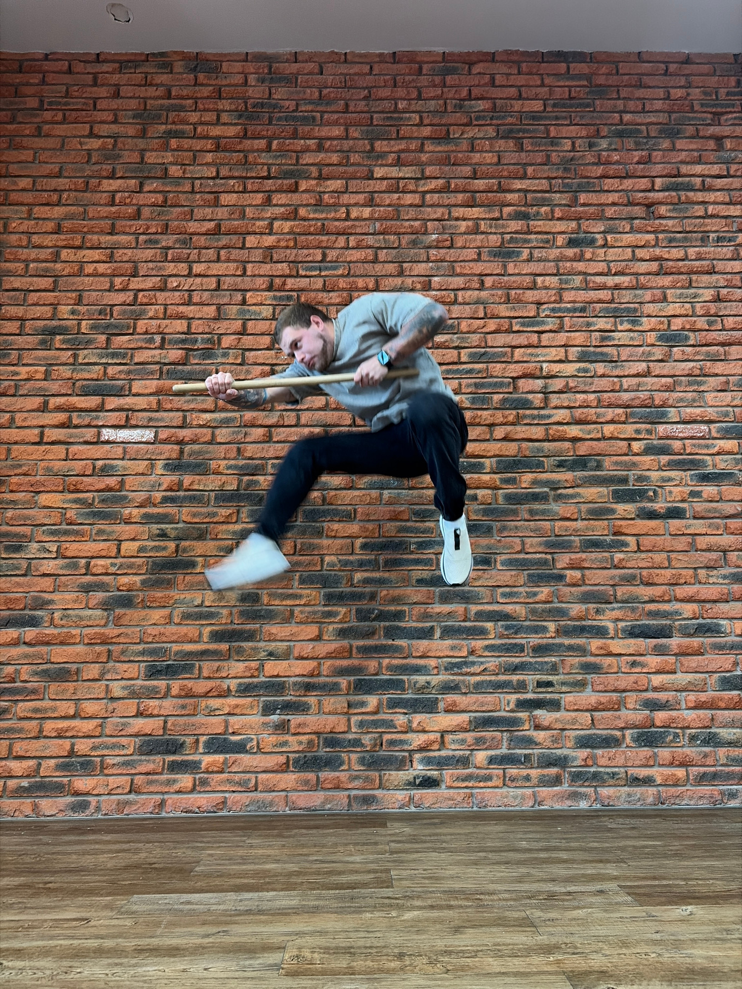 A full-length, high-angle shot captures a young man in an unusual, gravity-defying pose against a textured brick wall, giving the impression he is standing on a vertical surface. The image is oriented…read more