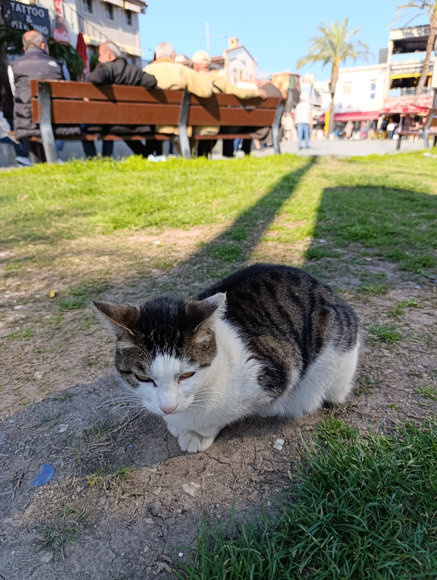 The image depicts a domestic cat, predominantly white with tabby patches, resting on a patch of earth and grass. In the background, a wooden bench is occupied by several people, their backs to the cam…read more