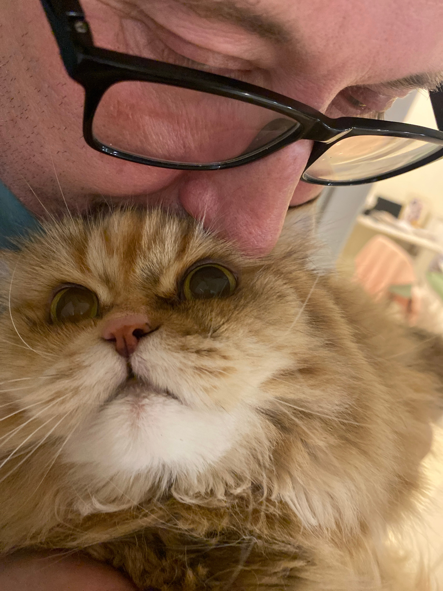 A close-up shot depicts a light orange, long-haired cat being held by a person. The person wears black-rimmed eyeglasses. The cat has large, round, greenish-yellow eyes and a small pink nose. The sett…read more