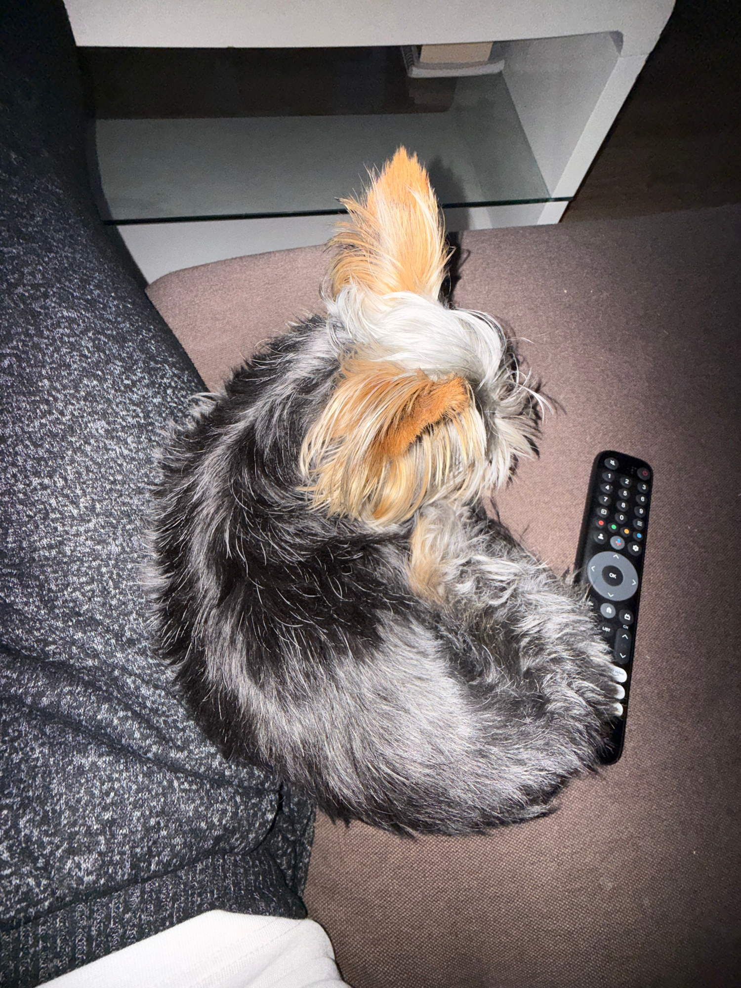 A high-angle shot shows a Yorkshire Terrier curled up on a person's lap, which is covered with a gray sweater. Next to the dog is a black TV remote control on a brown couch. Part of a white, modern-lo…read more