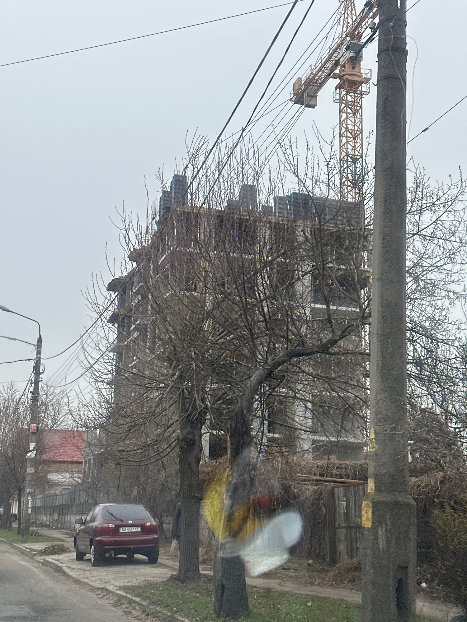 The image depicts a street scene in Kyiv, Ukraine, recognizable by the car license plate featuring the Ukrainian flag. The scene is observed through a window, possibly of a moving vehicle, as suggeste…read more