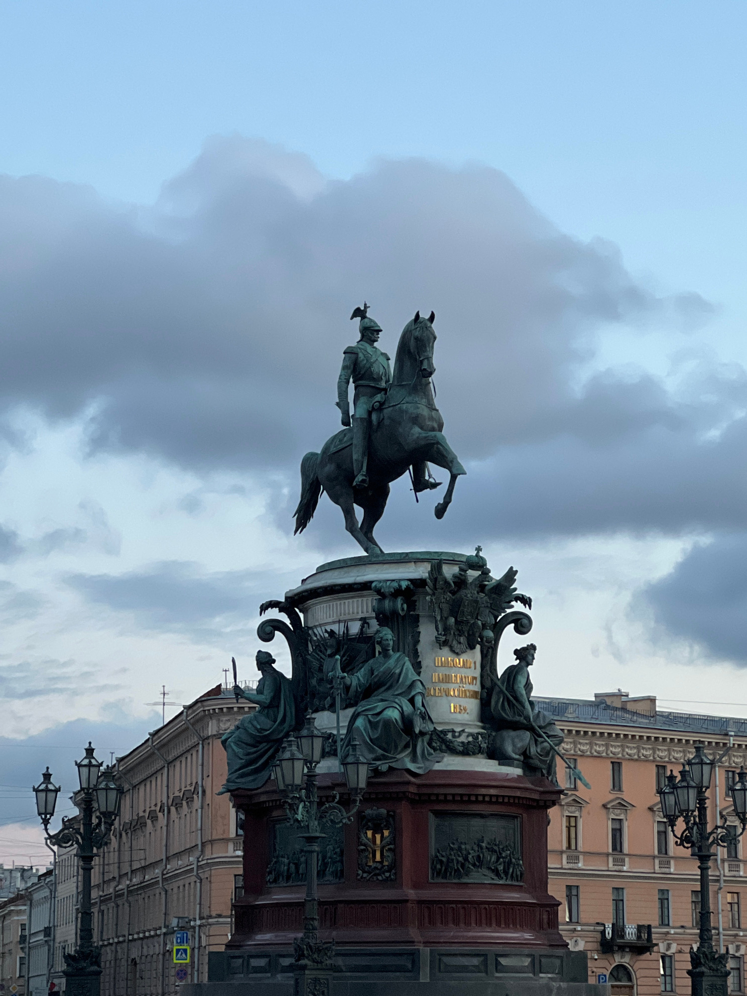 The image shows the equestrian statue of Nicholas I in Saint Petersburg, Russia. The monument stands prominently against a cloudy sky. The statue depicts Nicholas I on horseback, with figures surround…read more
