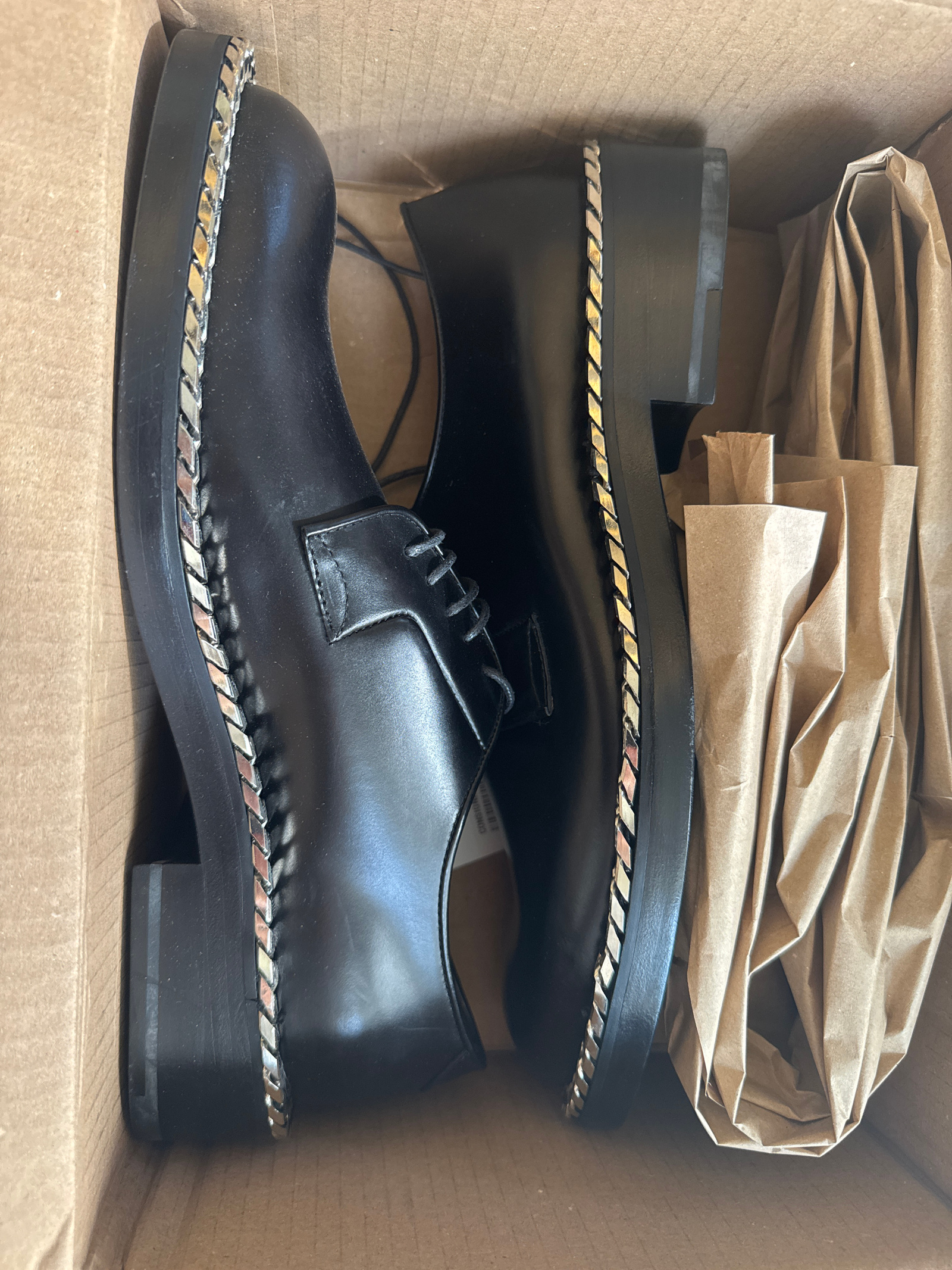 Inside a light brown corrugated cardboard box in Erba, Italy, two black formal shoes are presented. The shoes feature a smooth, polished black upper with black laces. Each shoe is distinguished by a p…read more