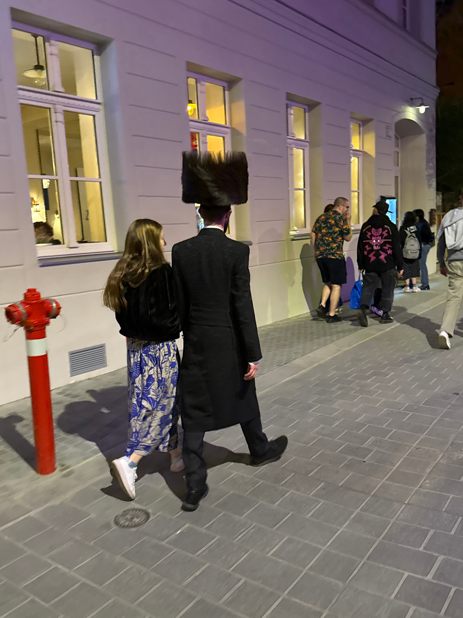 A photograph captures a group of people in Budapest, Hungary, at night. A traditionally dressed Jewish man in a black coat and hat walks beside a young woman with long blonde hair wearing a black jack…read more