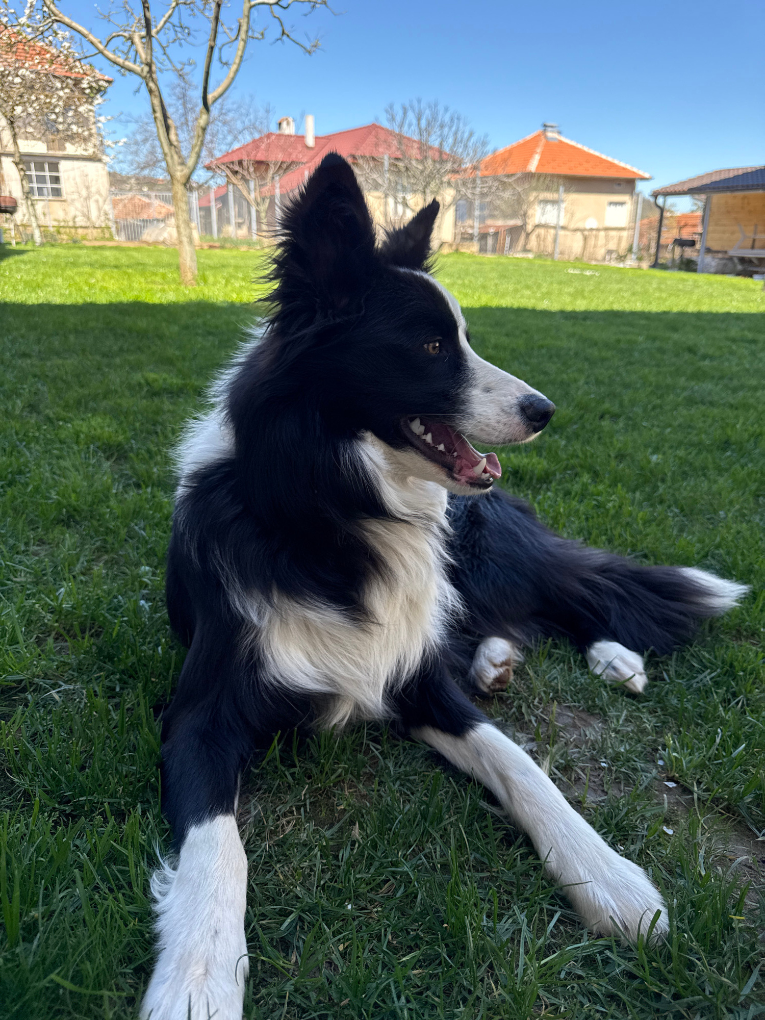 The image shows a black and white Border Collie dog lying on green grass. The dog is on its back, with its legs spread out and its mouth open. The background includes a house with a red tile roof, and…read more
