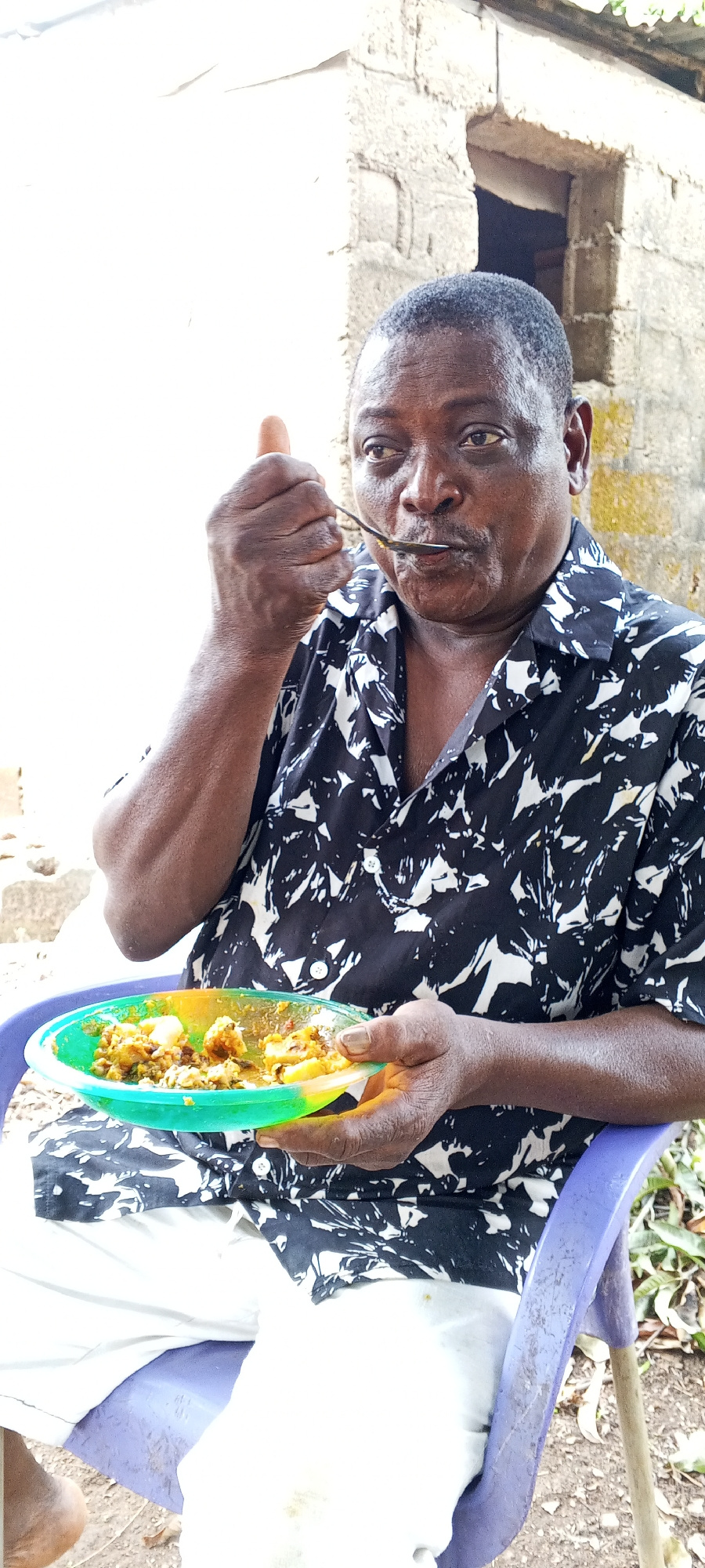 An adult Black man is captured in an outdoor setting, seated on a purple plastic chair, actively eating a meal. He is likely middle-aged or older, with short, dark hair, a mustache, and a focused expr…read more