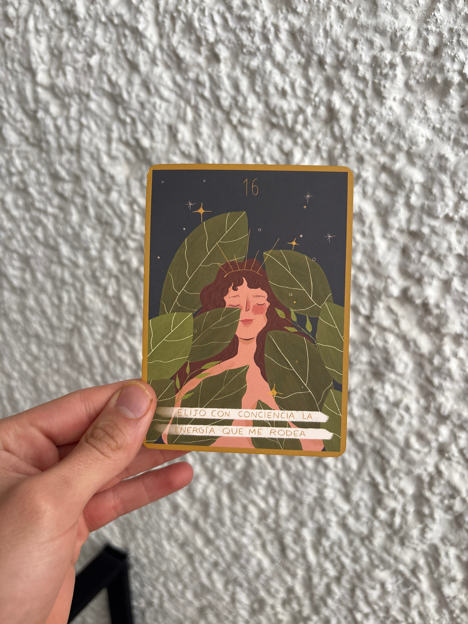A hand holds a rectangular card with a dark background on a textured white surface. The card features an illustration of a reclining figure surrounded by green leaves and botanical elements. Text is v…read more