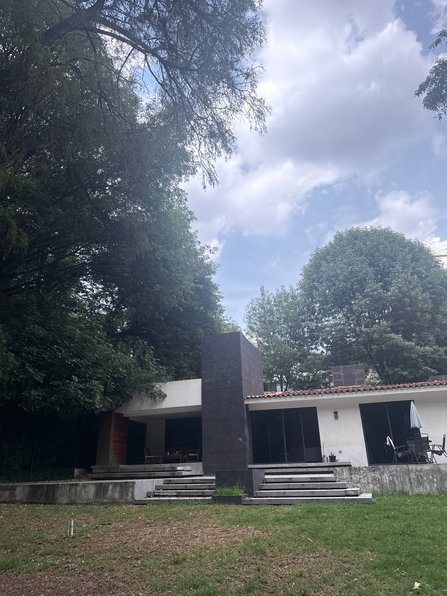 The image depicts a house and its surroundings, possibly located in San Bernardino Tlaxcalancingo, Mexico, based on the prompt's context. The house features a cream-colored exterior with dark-framed w…read more