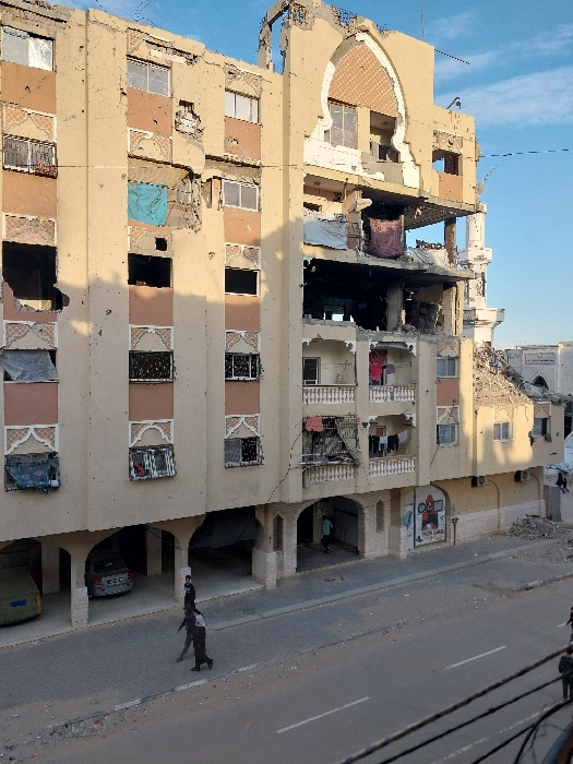 The image depicts a multi-story building that has suffered extensive damage, likely from an explosion or conflict. The building, constructed with a light beige or sandy-colored facade, dominates the l…read more