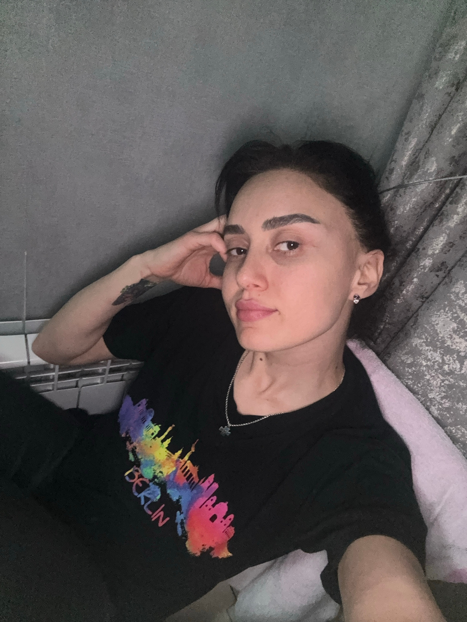 A woman is lying down. Her head is resting on her hand. She is wearing a black t-shirt with a colorful Berlin skyline design on the front. She has dark hair and is wearing earrings and a necklace. Her…read more