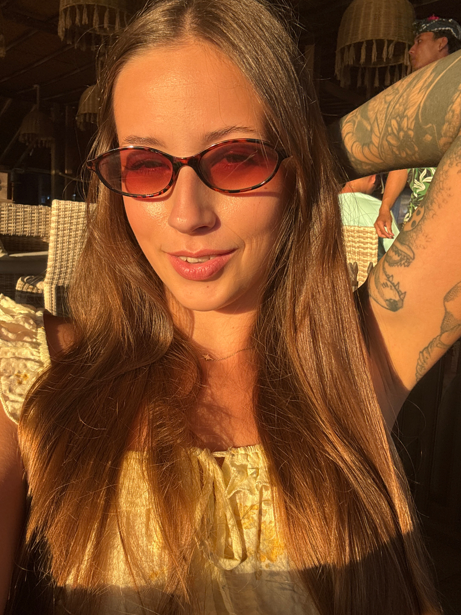 A medium shot depicts a fair-skinned female wearing red-tinted sunglasses. She has light brown hair and is smiling slightly. She is wearing a light-colored patterned top. In the background, a man with…read more