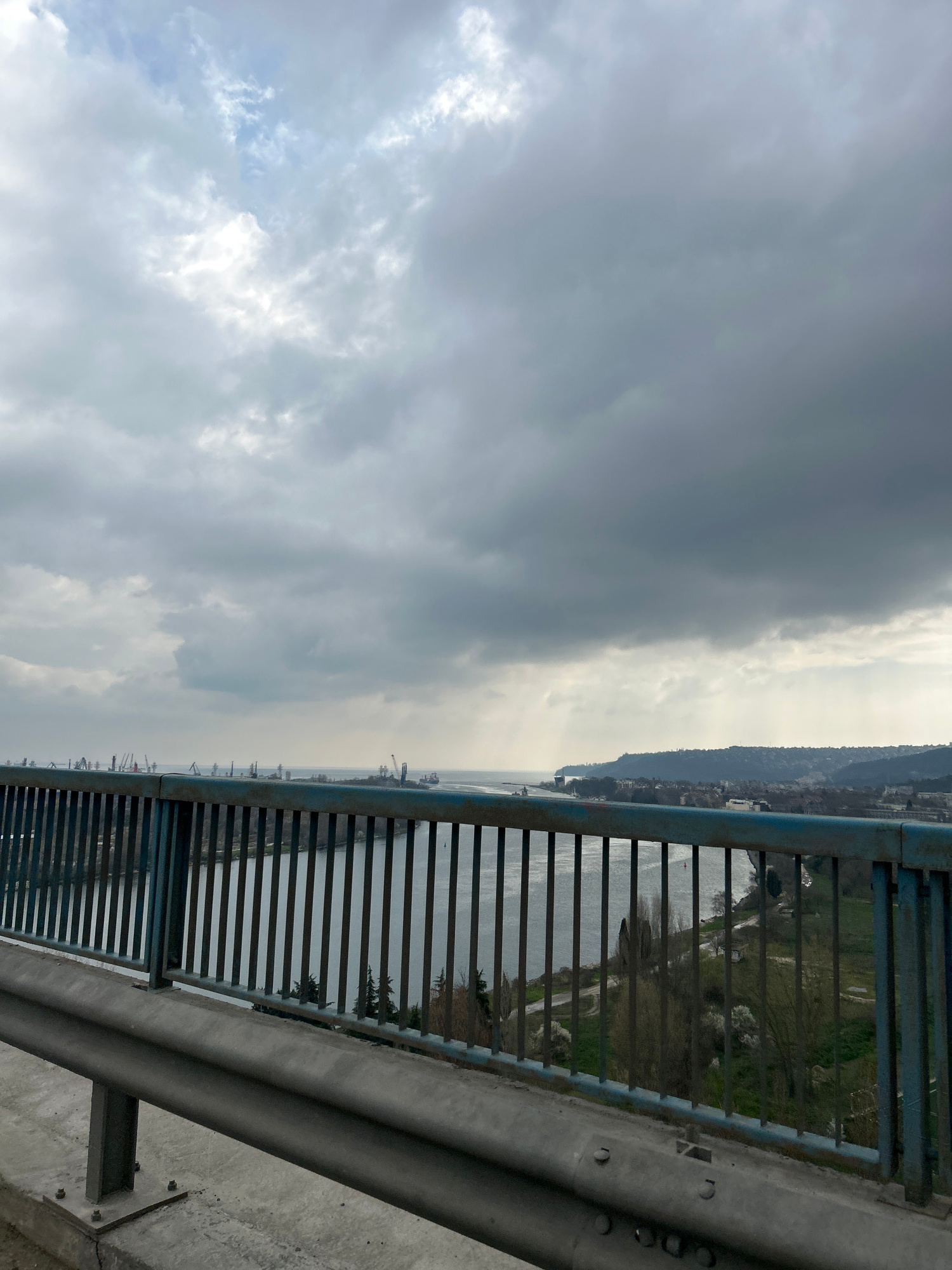 The image shows a view from a bridge in the city of Unknown, Unknown. A metal railing runs along the right side of the frame, partially obscuring the view. Beyond the railing is a body of water with a…read more