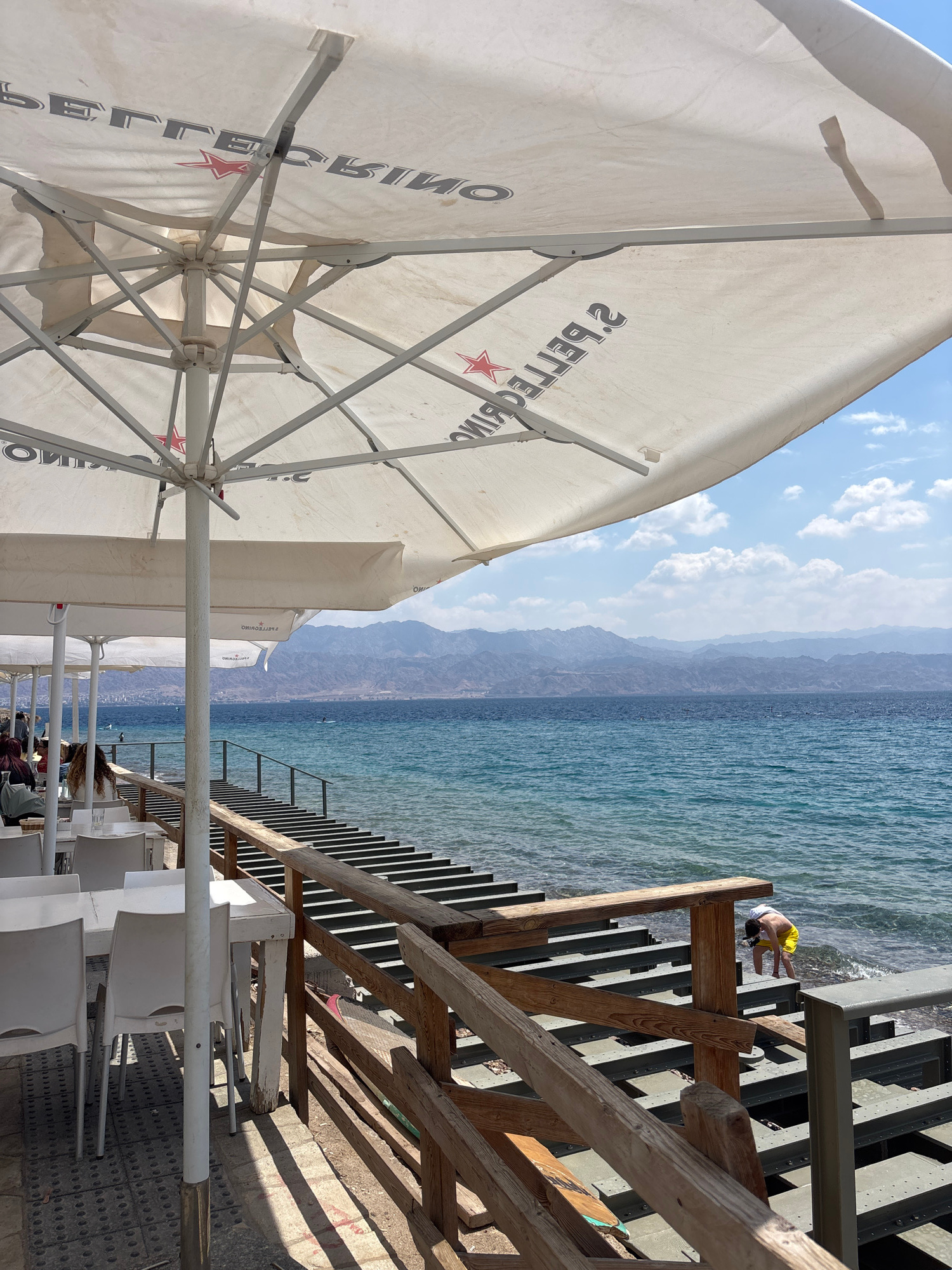 The image presents a sunlit beachfront scene at an outdoor dining area in Eilat, Israel. In the immediate foreground, the underside of a large, white commercial umbrella dominates the upper left, disp…read more