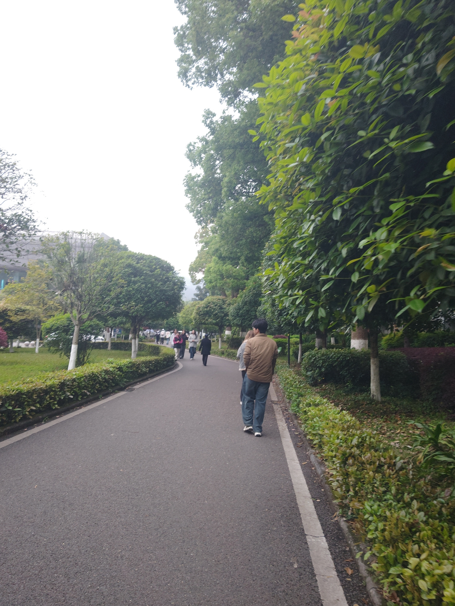 The image shows a paved road winding through a park-like setting in Chongqing High-tech Zone, China. The road is lined with manicured greenery. A man in a brown jacket and blue jeans is walking along…read more