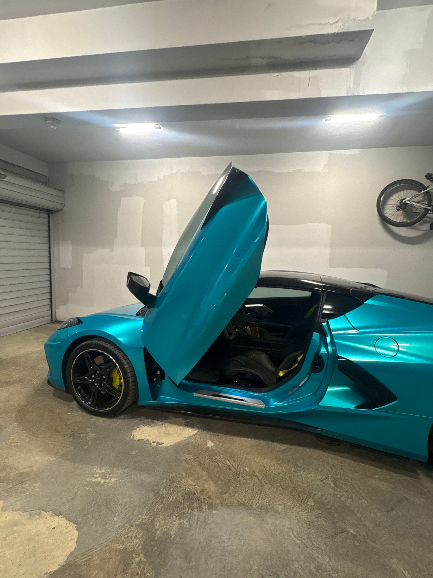 The image shows a turquoise sports car, likely a Corvette C8, parked in what appears to be a garage. The driver's side door is open, revealing a black interior with yellow accents. The car's wheel has…read more