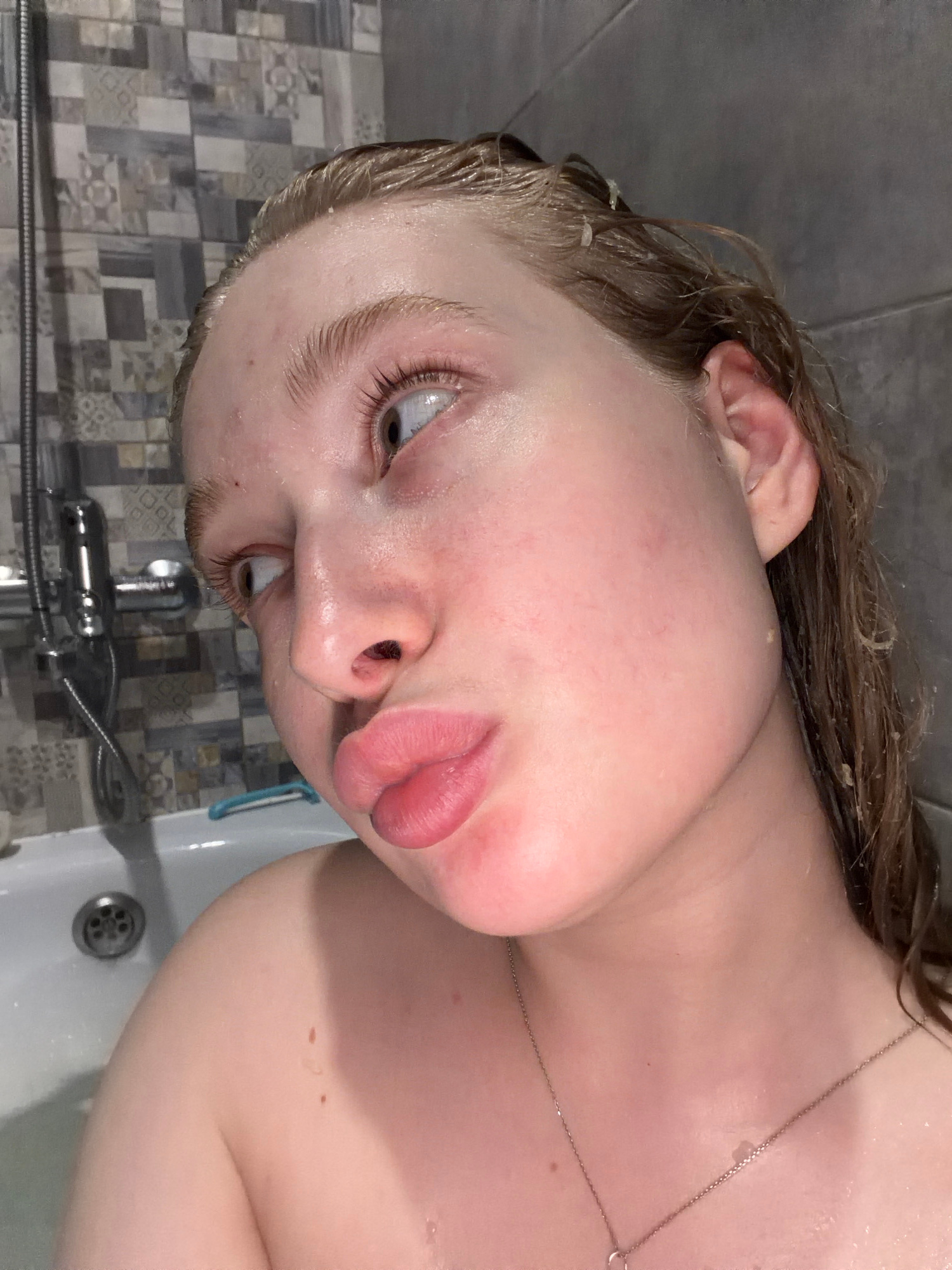 A close-up, upside-down, angled shot shows a woman's face and upper torso. She appears to be in a bathroom, likely taking a bath or shower, as indicated by the wet hair, water droplets on her skin, a…read more