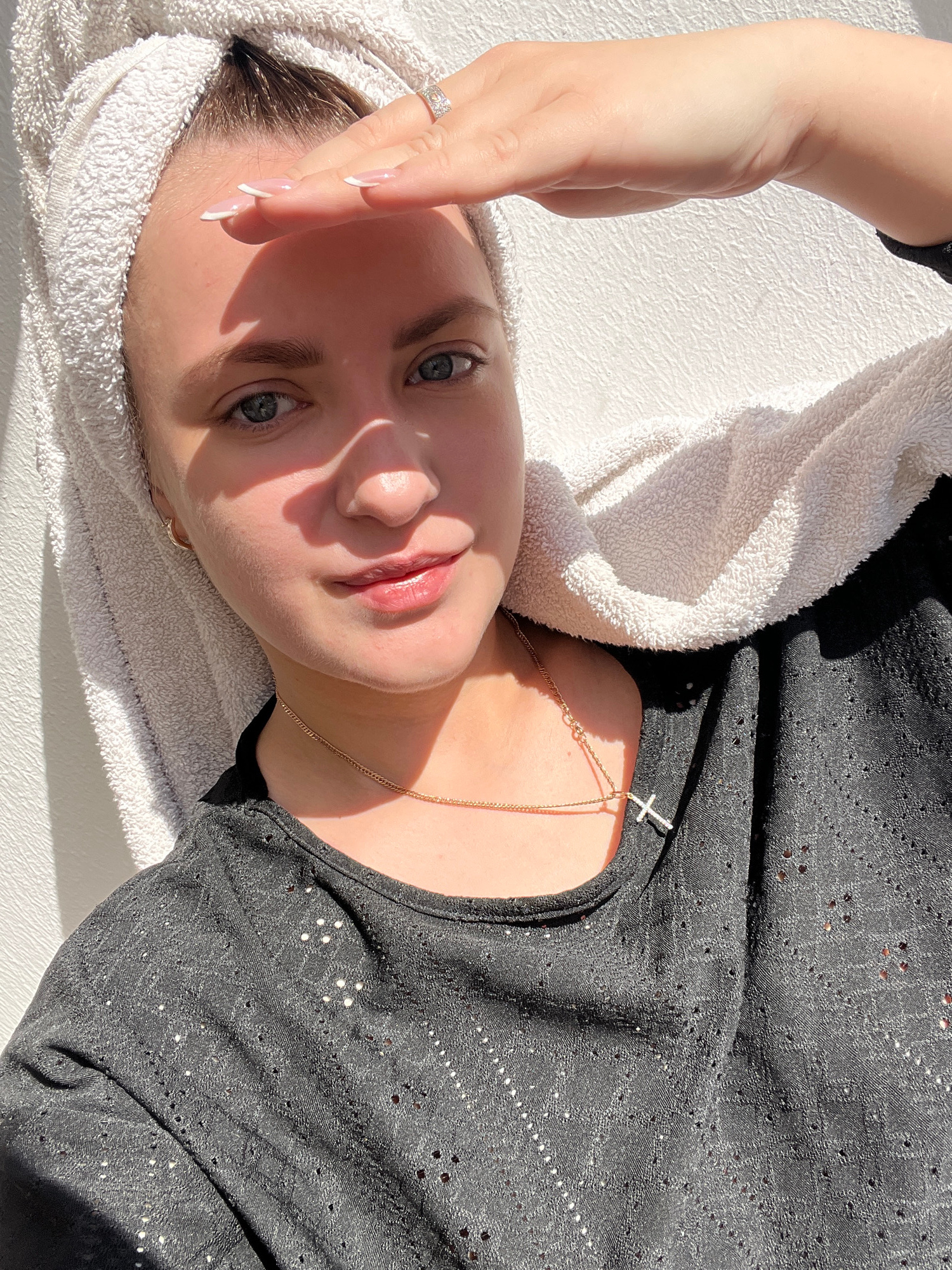 A woman with fair skin, light eyes, and neatly manicured nails lies on a white surface, possibly a bed or table. She is wearing a white towel wrapped around her head. She shields her eyes from the sun…read more