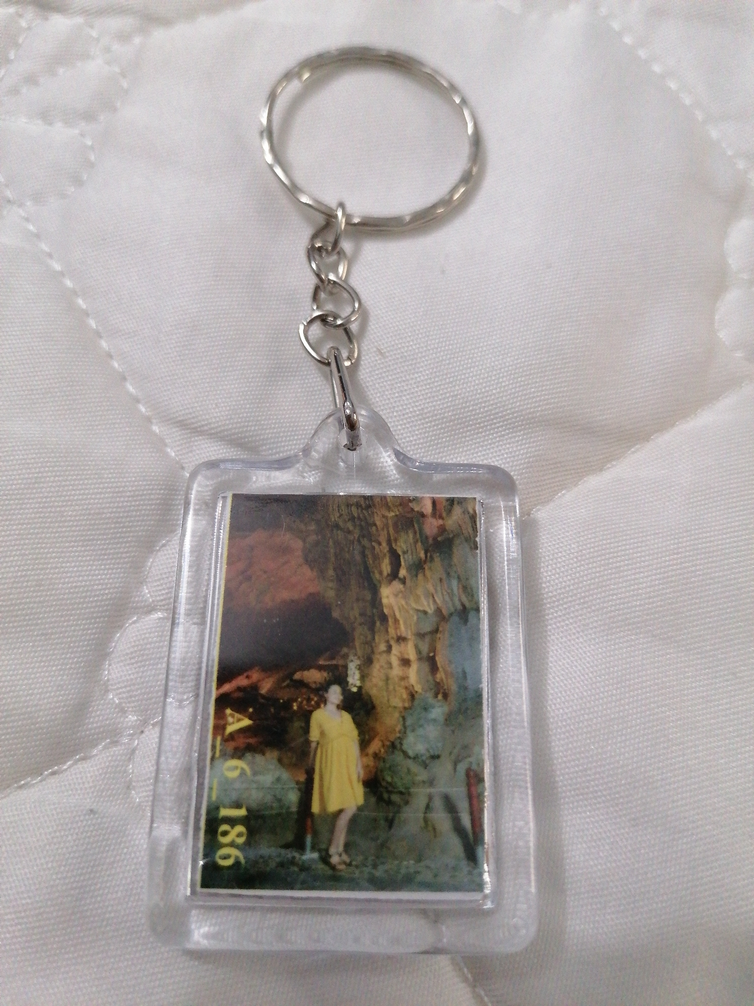 A silver-toned metal keychain with a clear rectangular plastic holder is centered on a white, quilted fabric surface. The keychain consists of a circular key ring attached to a chain that connects to…read more