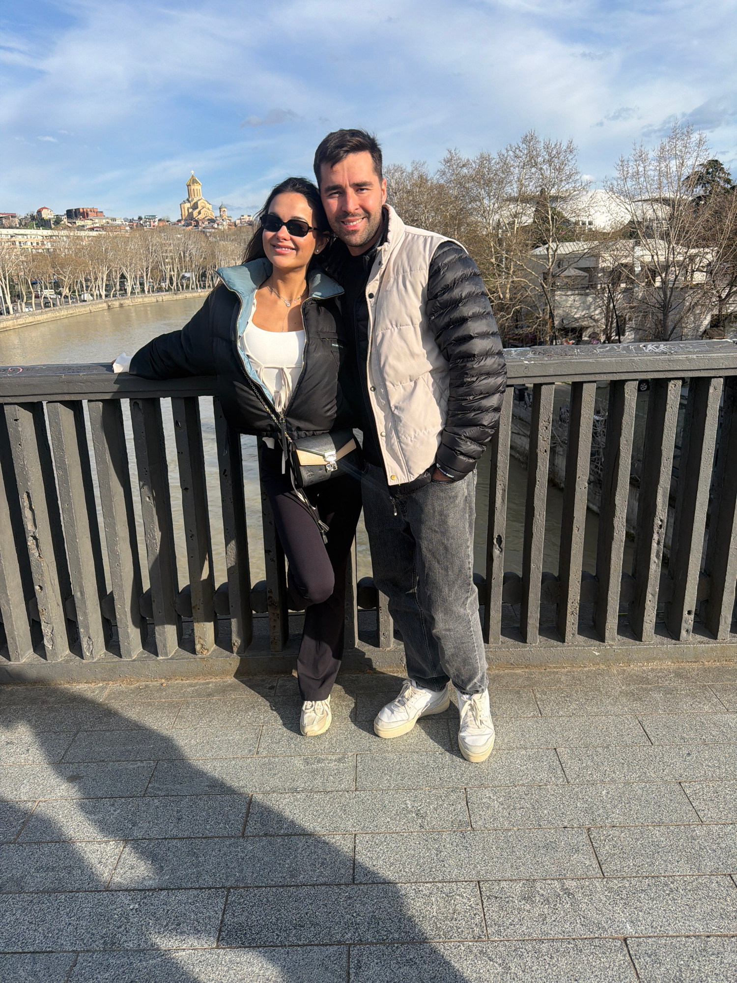 A man and a woman are photographed on a bridge, with the cityscape of Tbilisi, Georgia, visible in the background. The woman is wearing sunglasses, a black jacket, a white top, and black leggings, and…read more