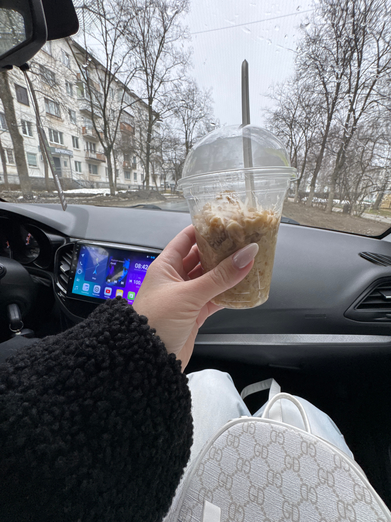 A hand holds a transparent plastic cup containing a beige, granular substance, possibly food, inside a car. The cup is covered with a lid and has a straw. The car's dashboard is visible with a central…read more