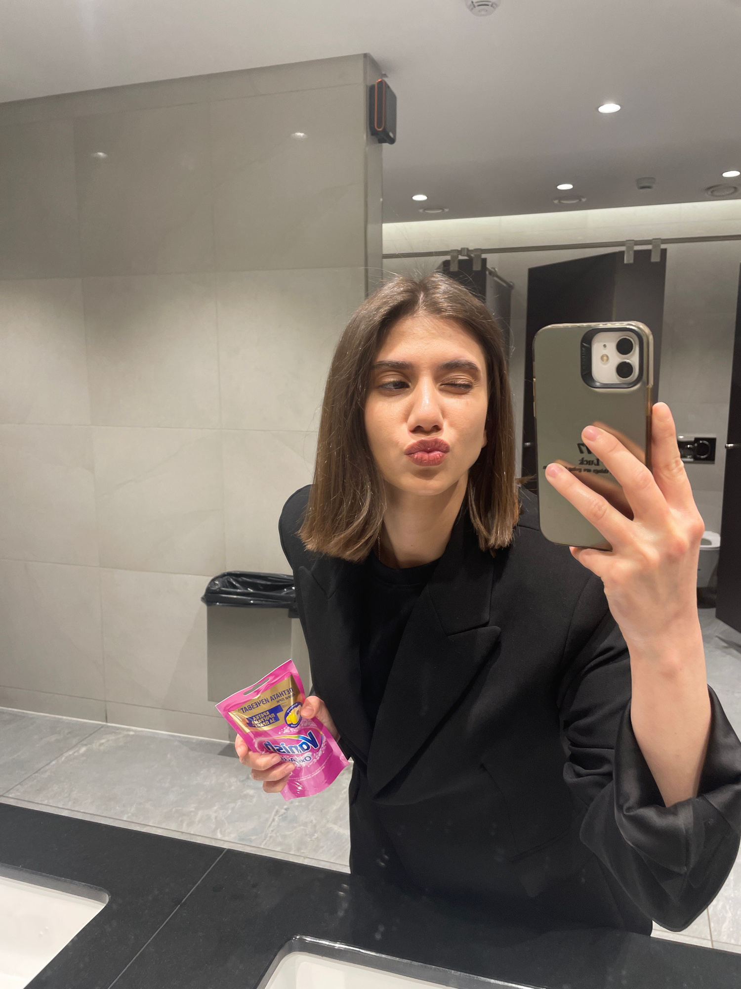 The image shows a woman taking a selfie in a restroom. She is holding a pink packet in her left hand and a smartphone in her right. She is wearing a black jacket. The restroom has light grey tile wall…read more