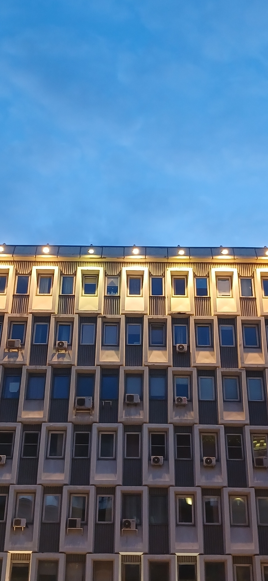 The image shows a tall building with a repetitive pattern of rectangular windows. Many of the windows have air conditioning units installed beneath them. The building is illuminated from above by a ro…read more