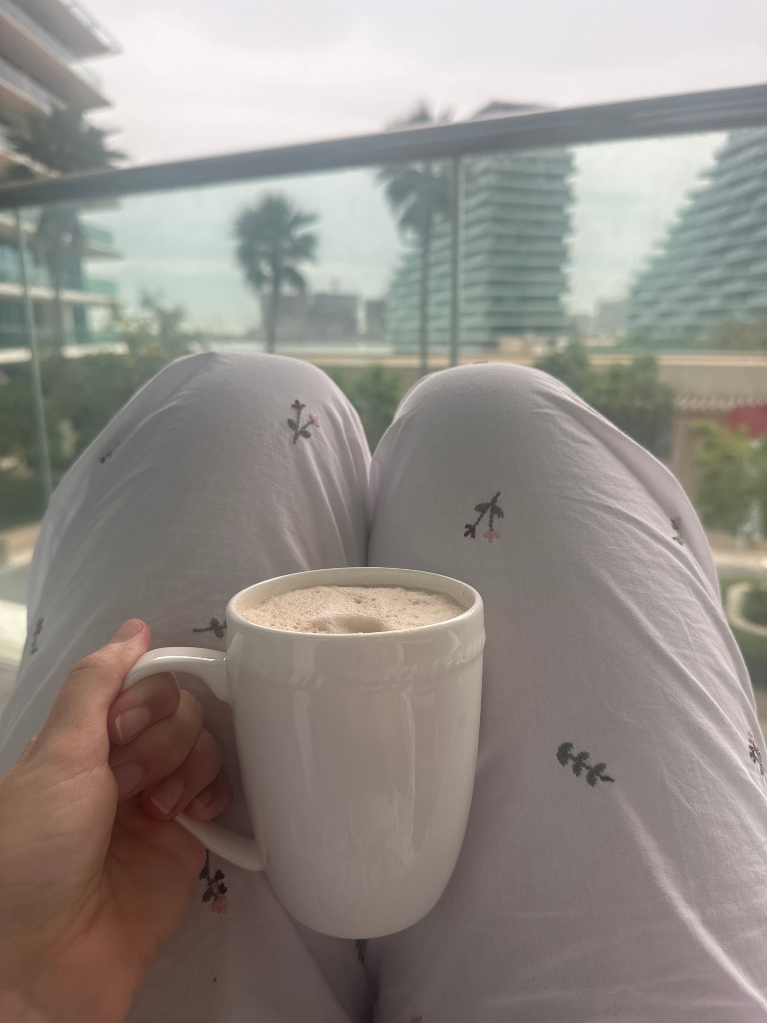 A person sits with crossed legs, holding a white mug filled with a foamy beverage in their right hand. The person is wearing white pajama pants with small floral patterns. Outside a window, high-rise…read more