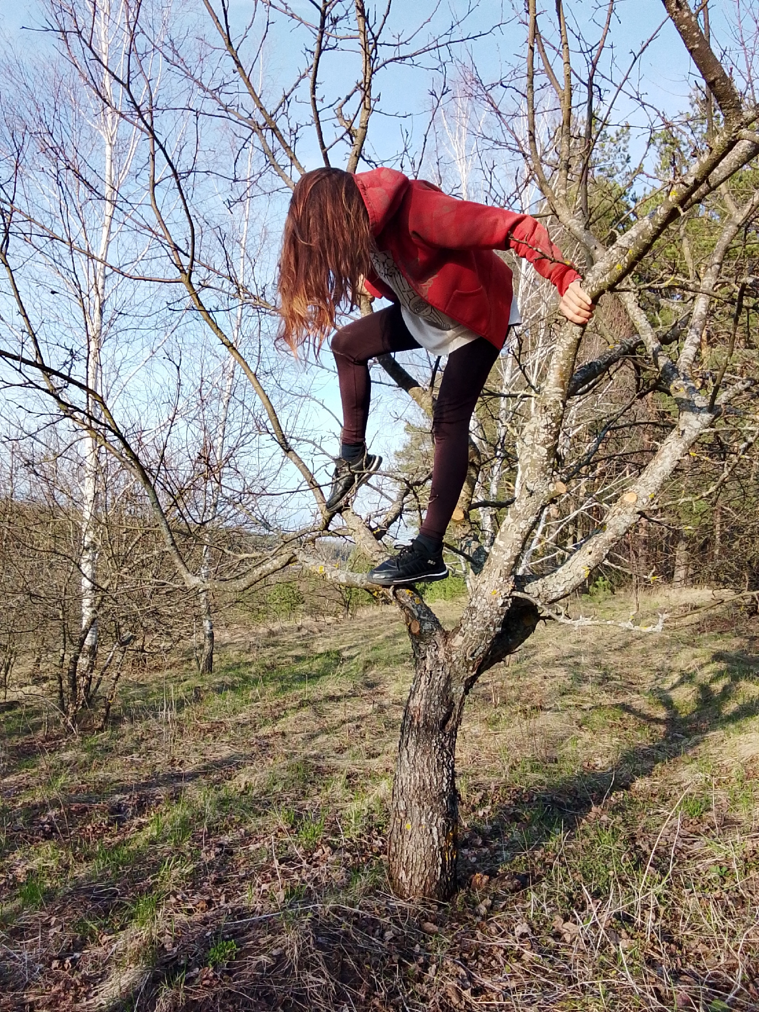 A person is seen climbing or perched in a bare deciduous tree in an outdoor, natural setting in Khlevnoye, Russia. The individual, appearing to have long, flowing brown hair that falls forward, wears…read more
