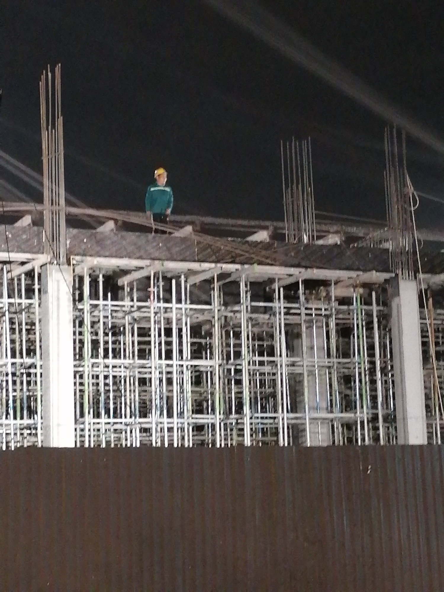 The image captures a dimly lit construction site at night in Bai Chay Ward, Vietnam. The main subject is a single individual, presumably a construction worker, positioned on an elevated level of the uā¦read more