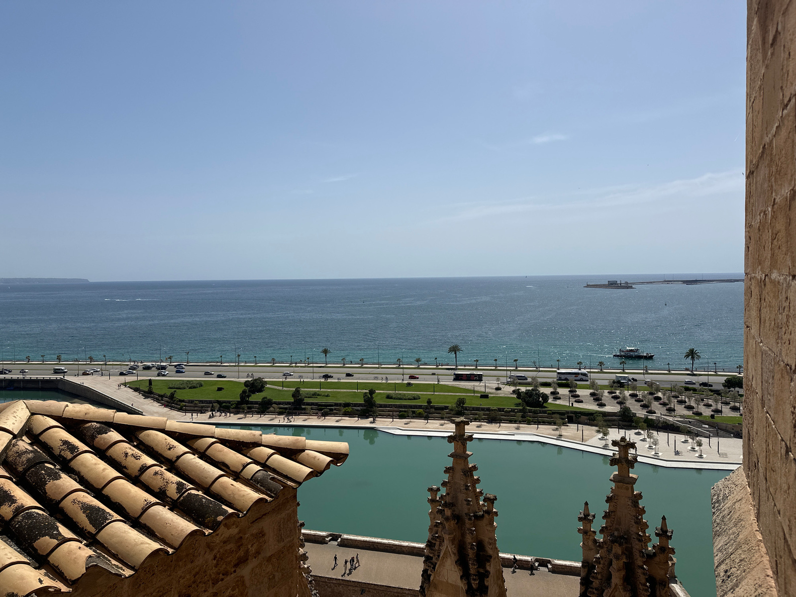 The image shows an elevated view of a coastal scene in Palma, Spain, likely taken from the Palma Cathedral. The Mediterranean Sea extends to the horizon under a clear, bright sky. In the midground is…read more