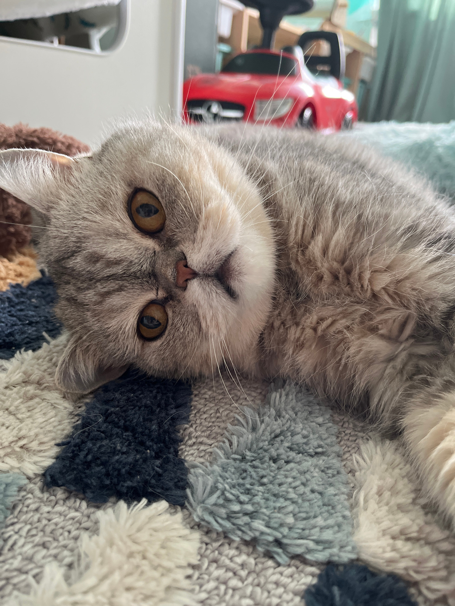 An adorable domestic cat is captured in a close-up, head-on shot, lying on its back with its face upside down. The cat has soft, fluffy grey and white fur, prominent long white whiskers, and a small p…read more