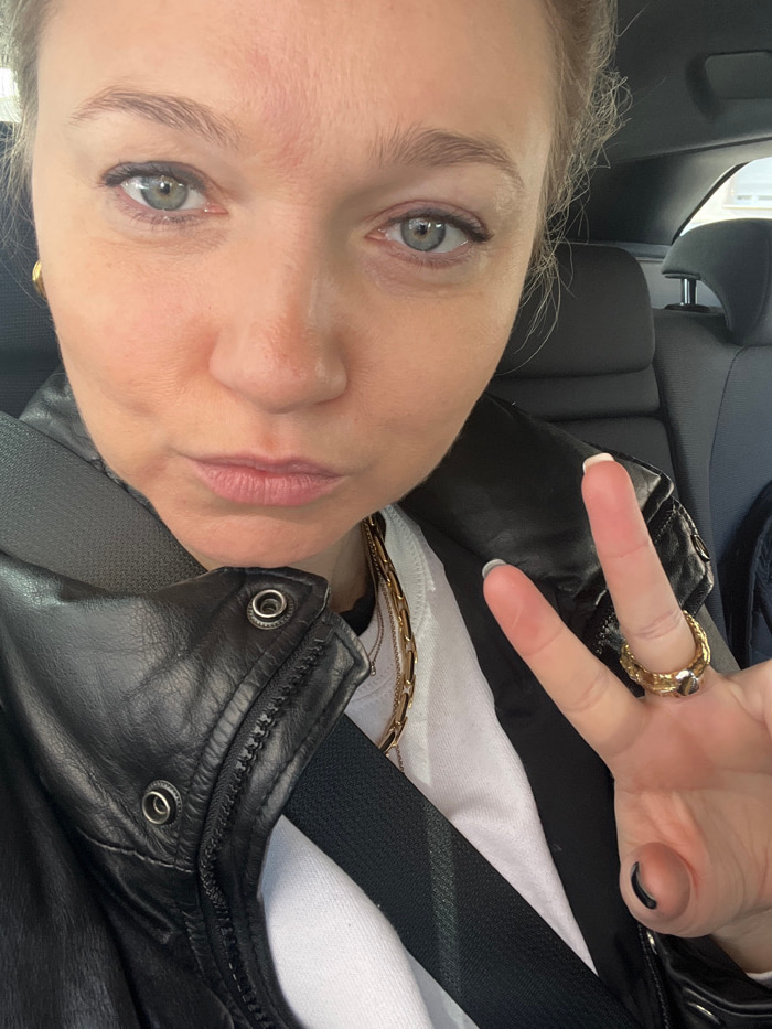 A close-up selfie captures an individual seated inside a vehicle. The subject, appearing female, has fair skin, light-colored eyes, and light hair pulled back. She wears a black leather jacket with si…read more