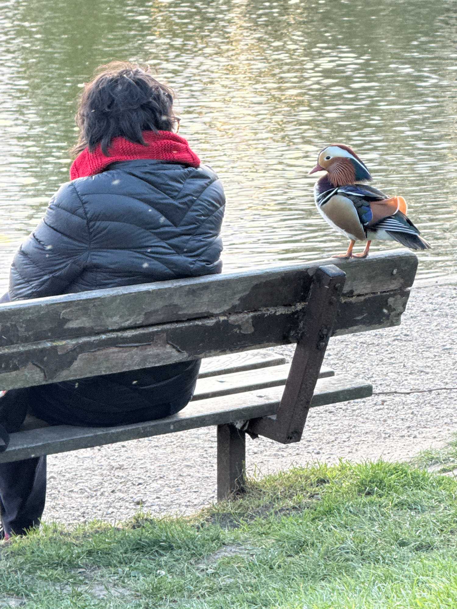 A Mandarin duck stands atop a wooden bench next to a person seated on the bench. The person has dark hair, wears a red scarf, a navy blue quilted jacket, and black pants. They face a body of water wit…read more