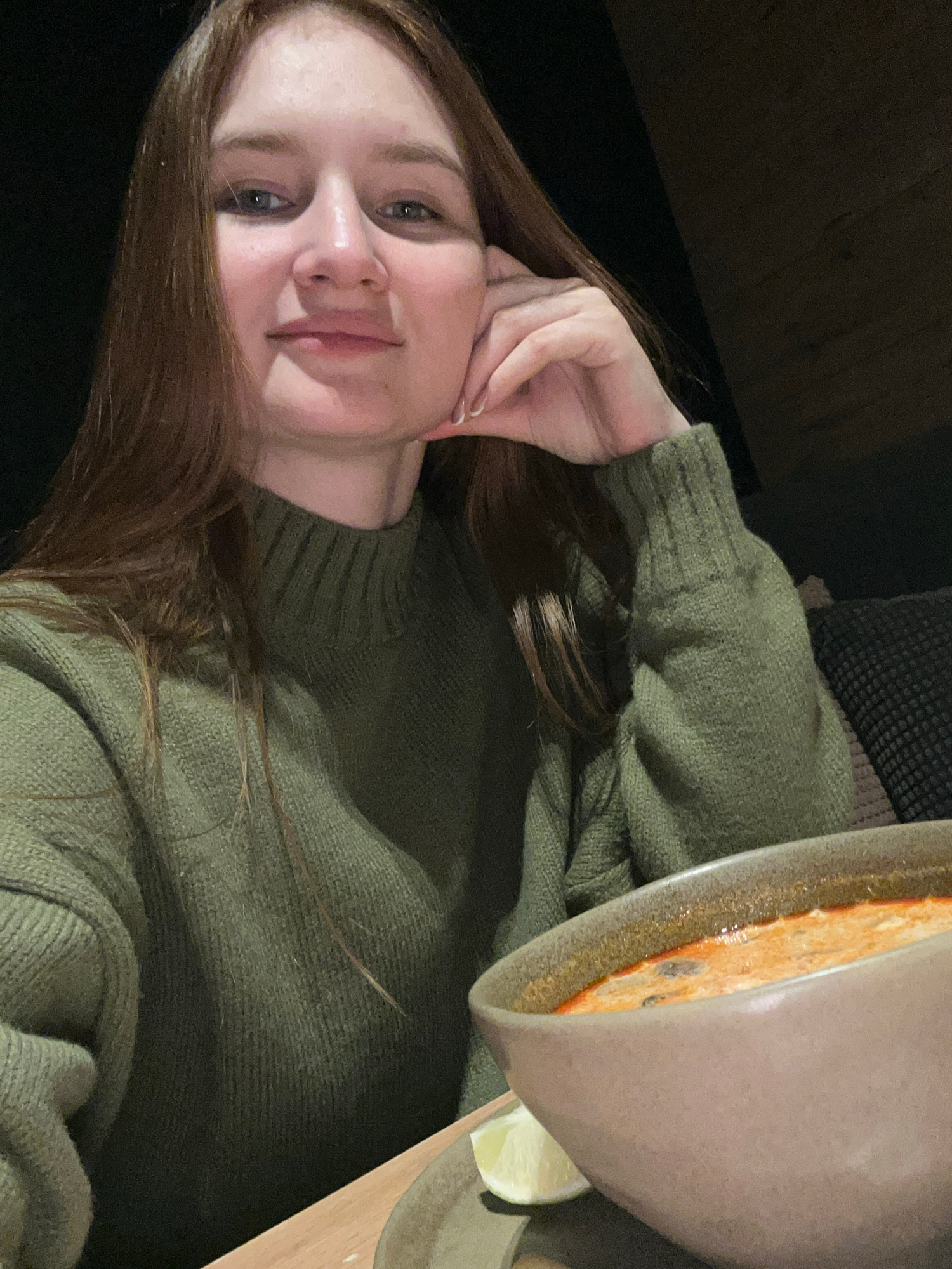 The original image is oriented diagonally, depicting a young woman indoors in Chaikovsky, Russia, likely during the evening or night given the dim, soft lighting. She appears to be in her late teens o…read more