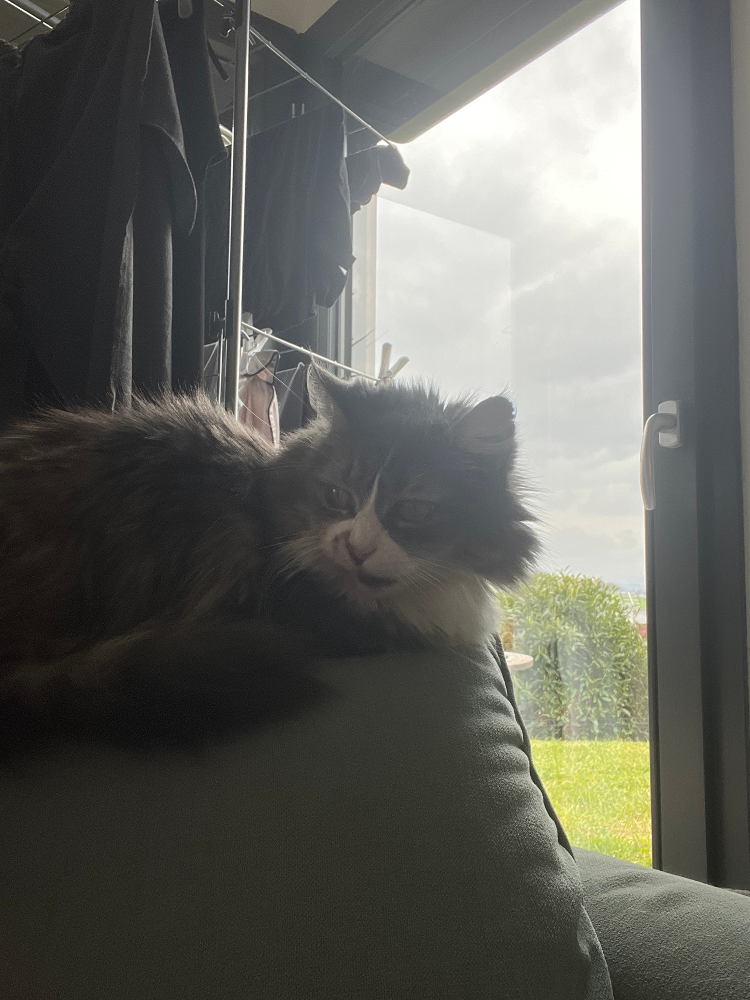 A gray and white cat is lying on a gray sofa, partially obscuring a window in a room. Outside the window, green foliage is visible. A clothes drying rack with dark clothing is in the foreground. The l…read more