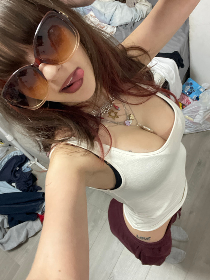 A selfie captures a young woman lying down. She's wearing large, gradient sunglasses and sticking out her tongue slightly. Her hair is reddish-brown, and she's adorned with layered necklaces. She is w…read more